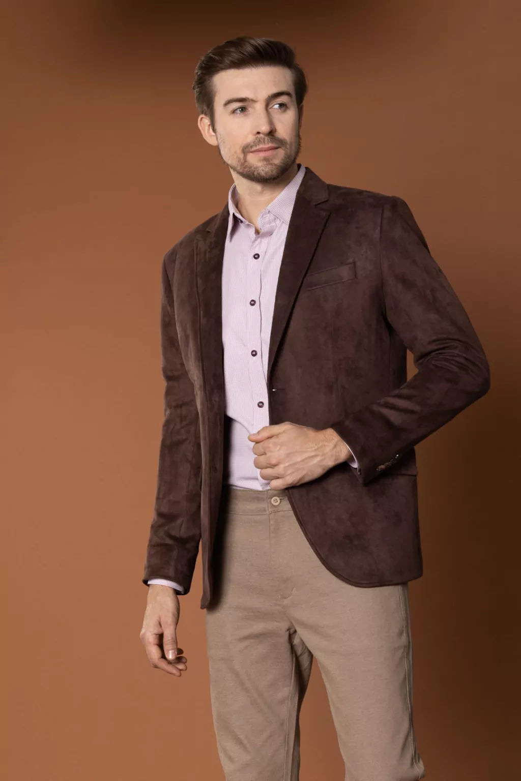 O blazer de suede slim fit marrom é uma peça de vestuário sofisticada e elegante, projetada para destacar a silhueta masculina de forma elegante e moderna. Feito de suede, um tecido macio e luxuoso, com uma textura distintiva, este blazer adiciona uma camada de sofisticação ao visual.