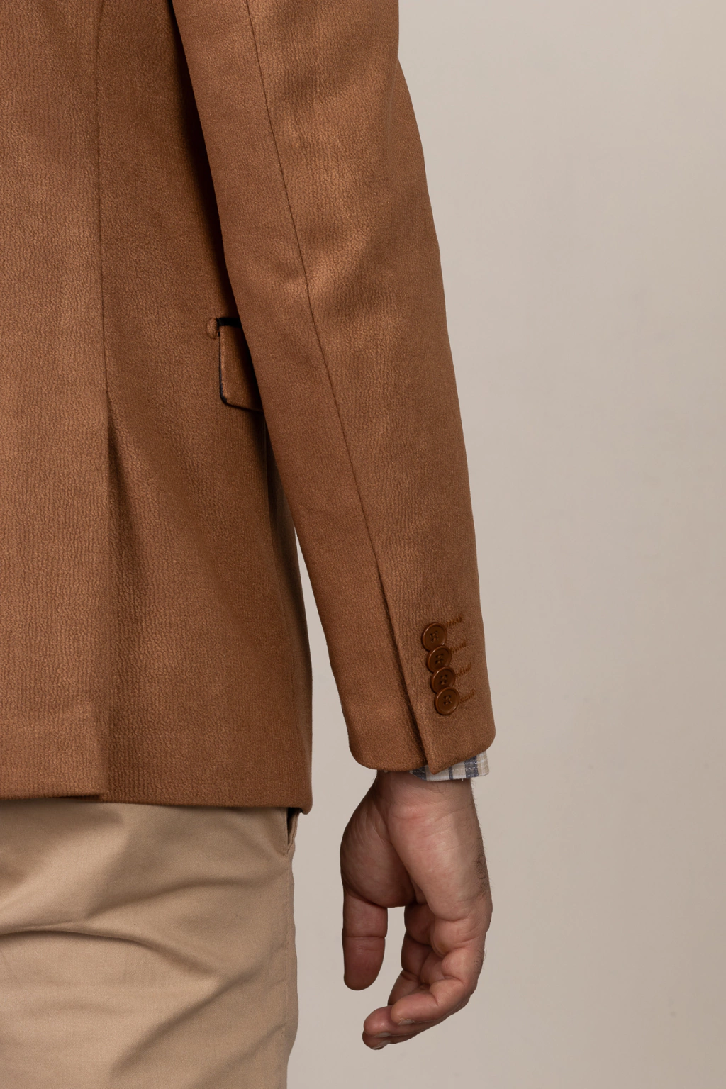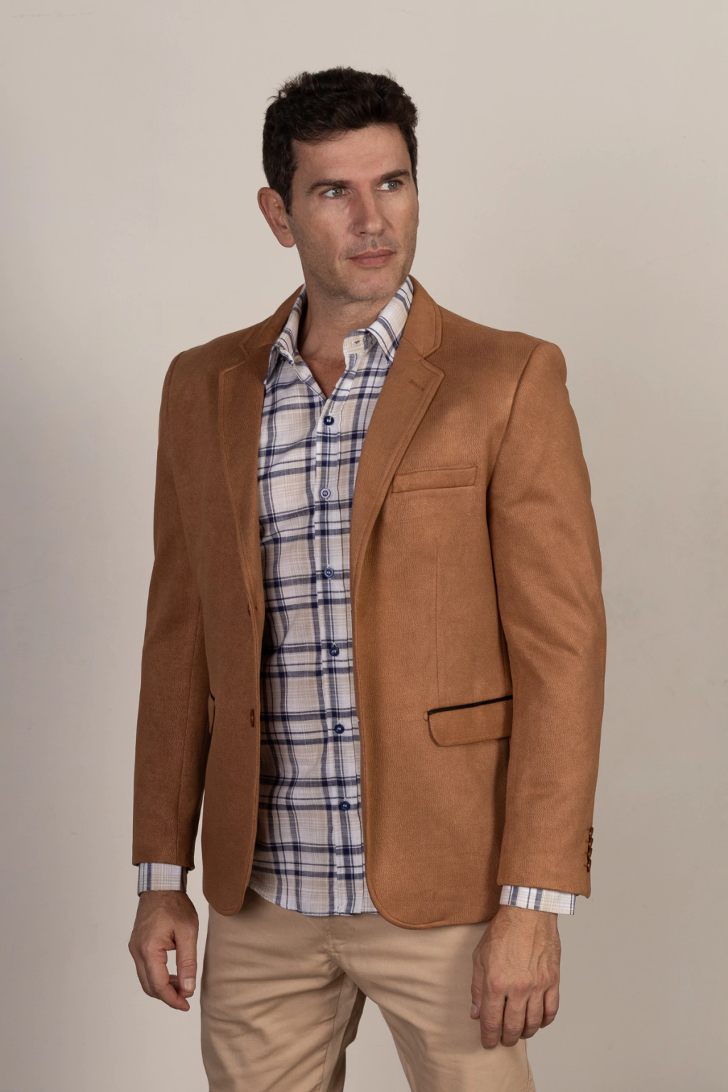 O blazer de suede texturizado semi slim caramelo é uma peça de vestuário sofisticada e elegante, projetada para destacar a silhueta masculina de forma elegante e moderna. Feito de suede, um tecido macio e luxuoso, com uma textura distintiva, este blazer adiciona uma camada de sofisticação ao visual.