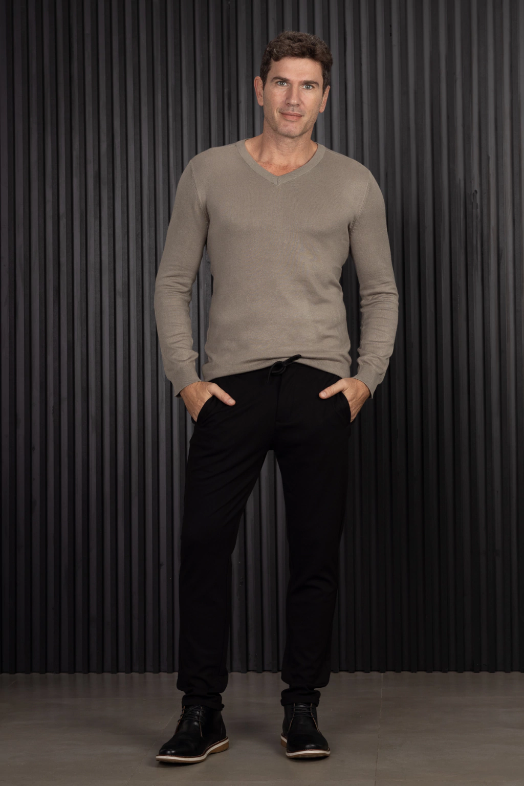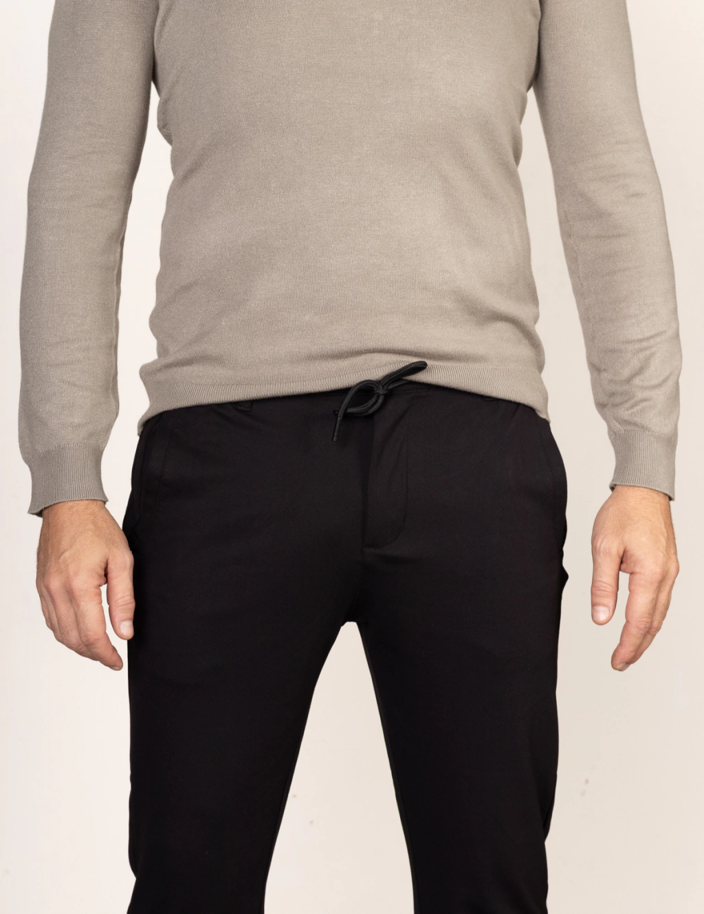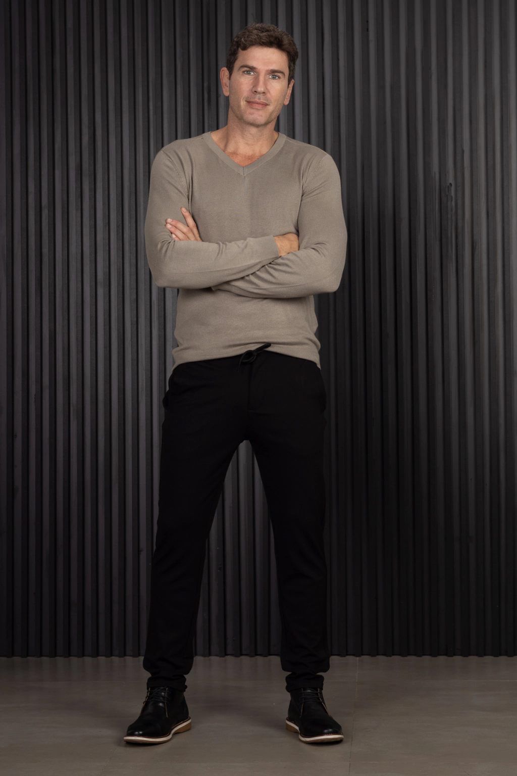 Descrição: Calça casual de malha com elastano preta, modelagem slim, conta com dois bolsos facas laterais e dois bolsos traseiros