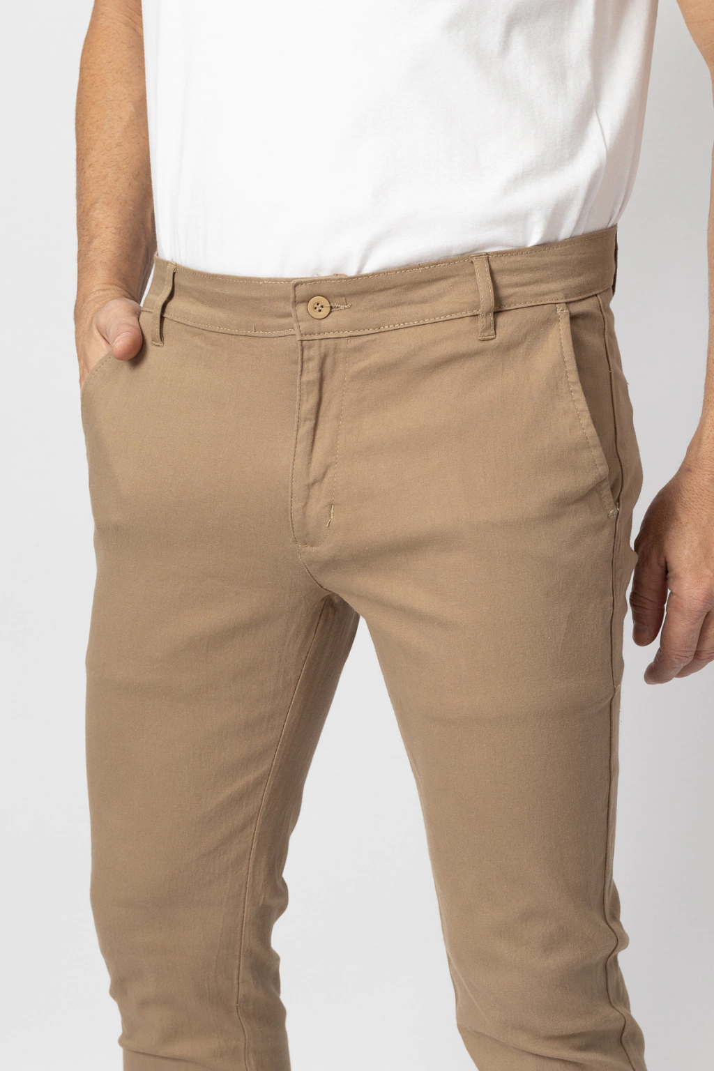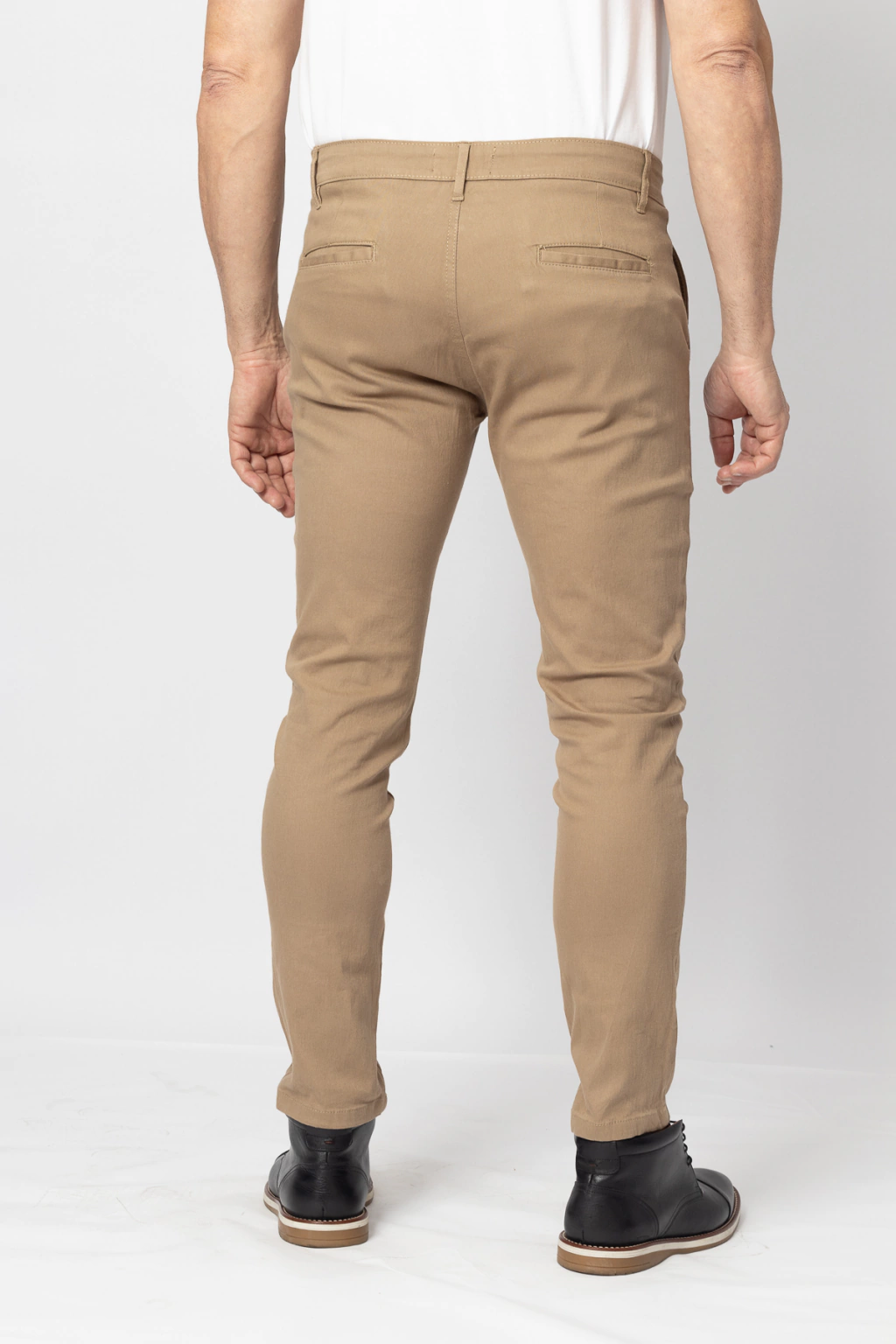 Descrição: Calça casual de sarja com elastano caqui , modelagem slim, conta com dois bolsos facas laterais e dois bolsos traseiros