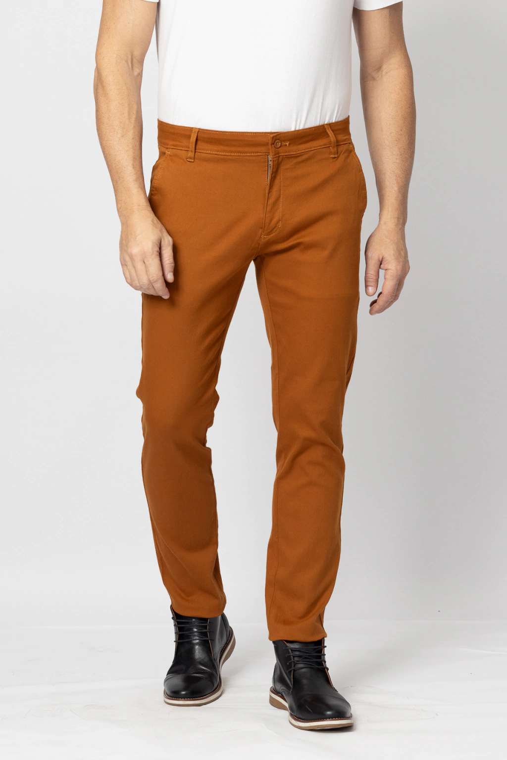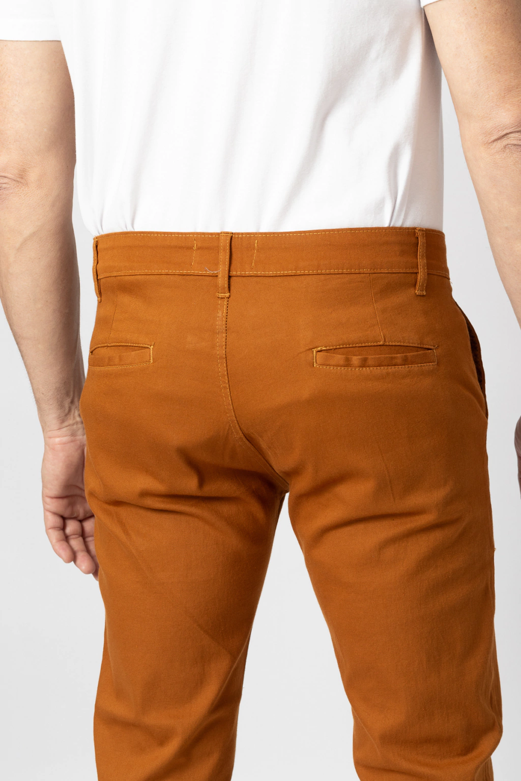 Descrição: Calça casual de sarja com elastano caramelo , modelagem slim, conta com dois bolsos facas laterais e dois bolsos traseiros