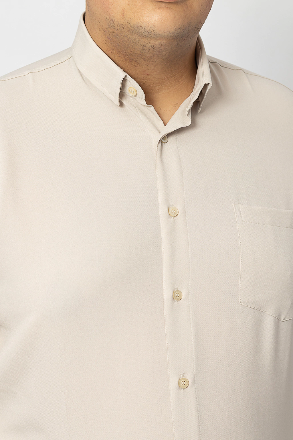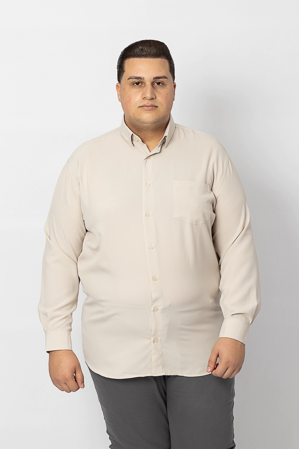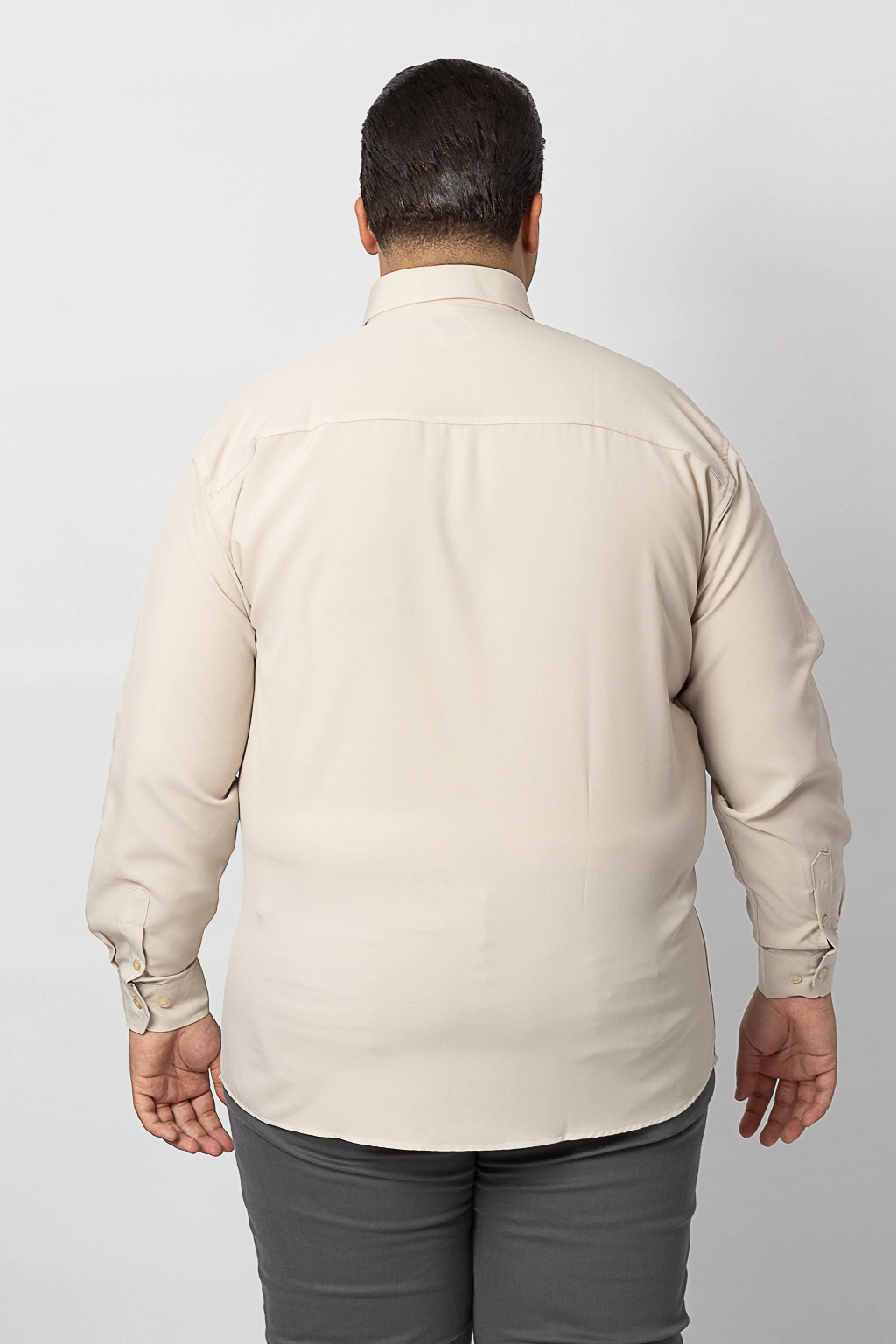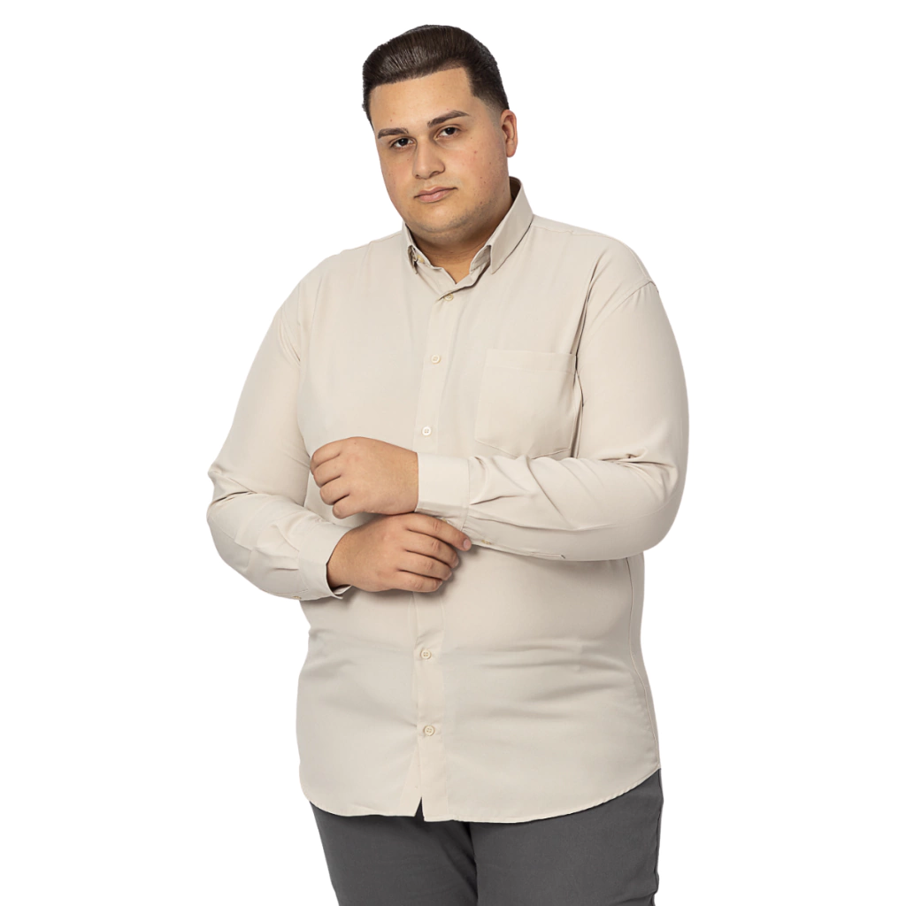 Descrição: Camisa de Microfibra Plus Size com Bolso Tradicional Confort Bege, confeccionada com poliéster, passa fácil