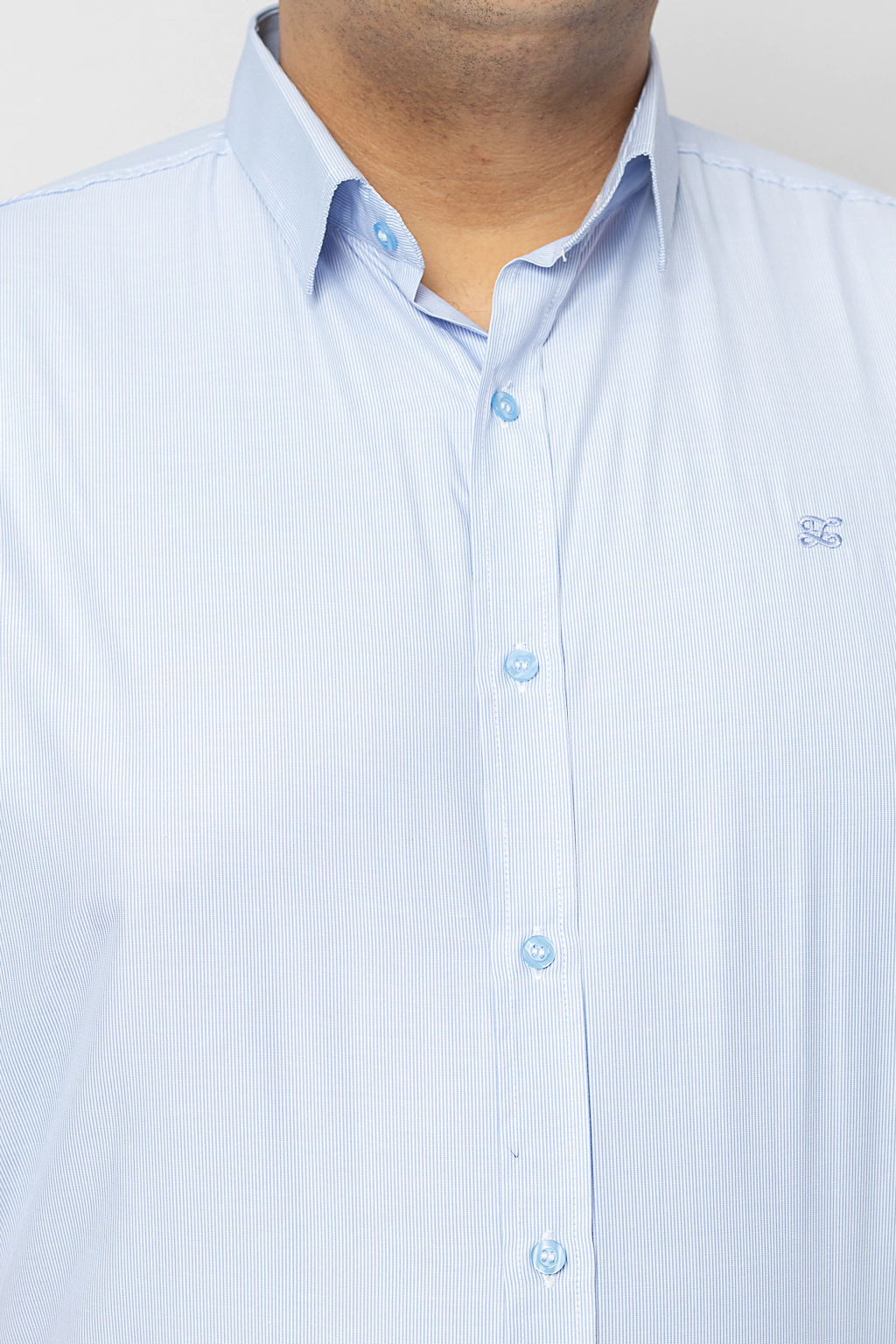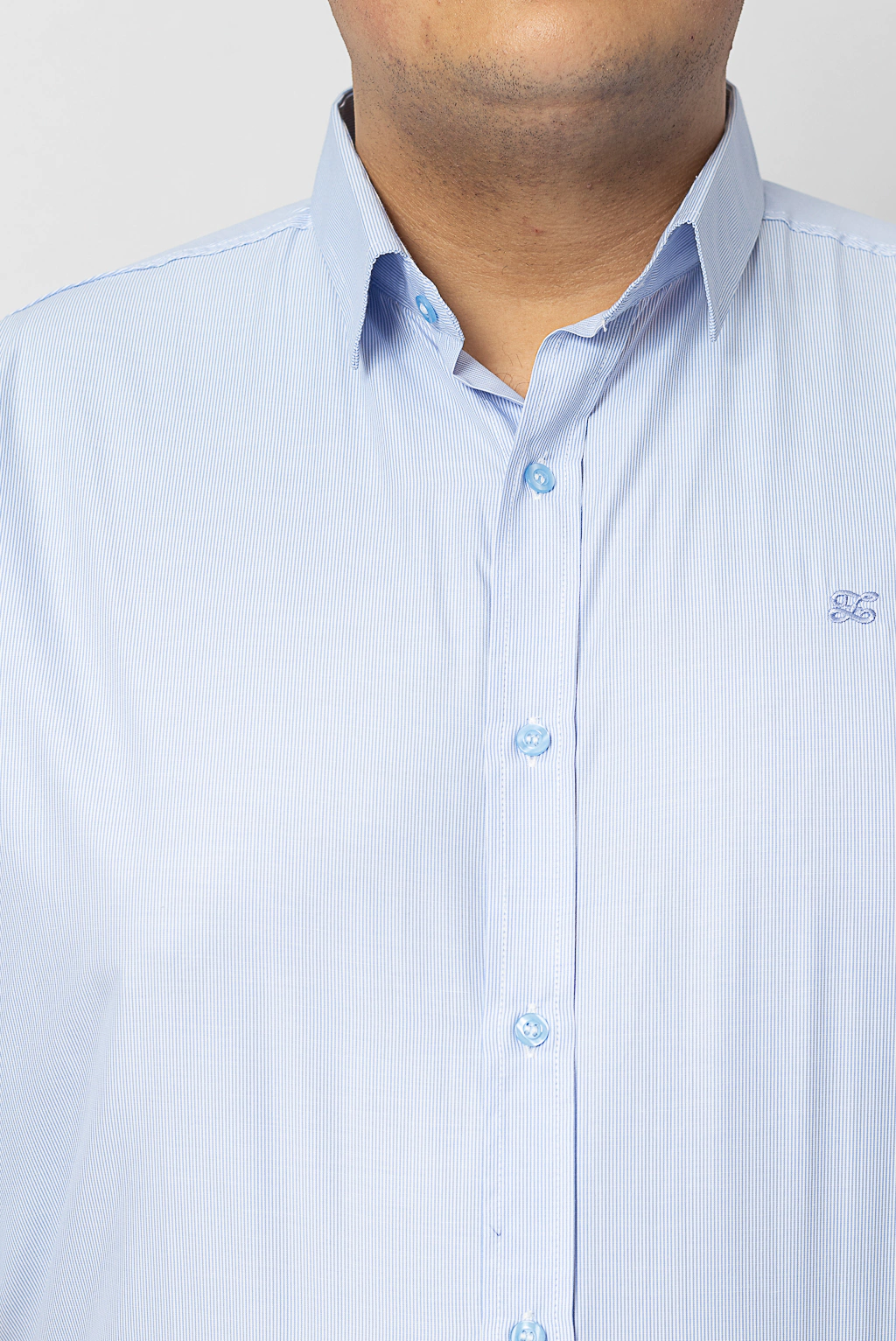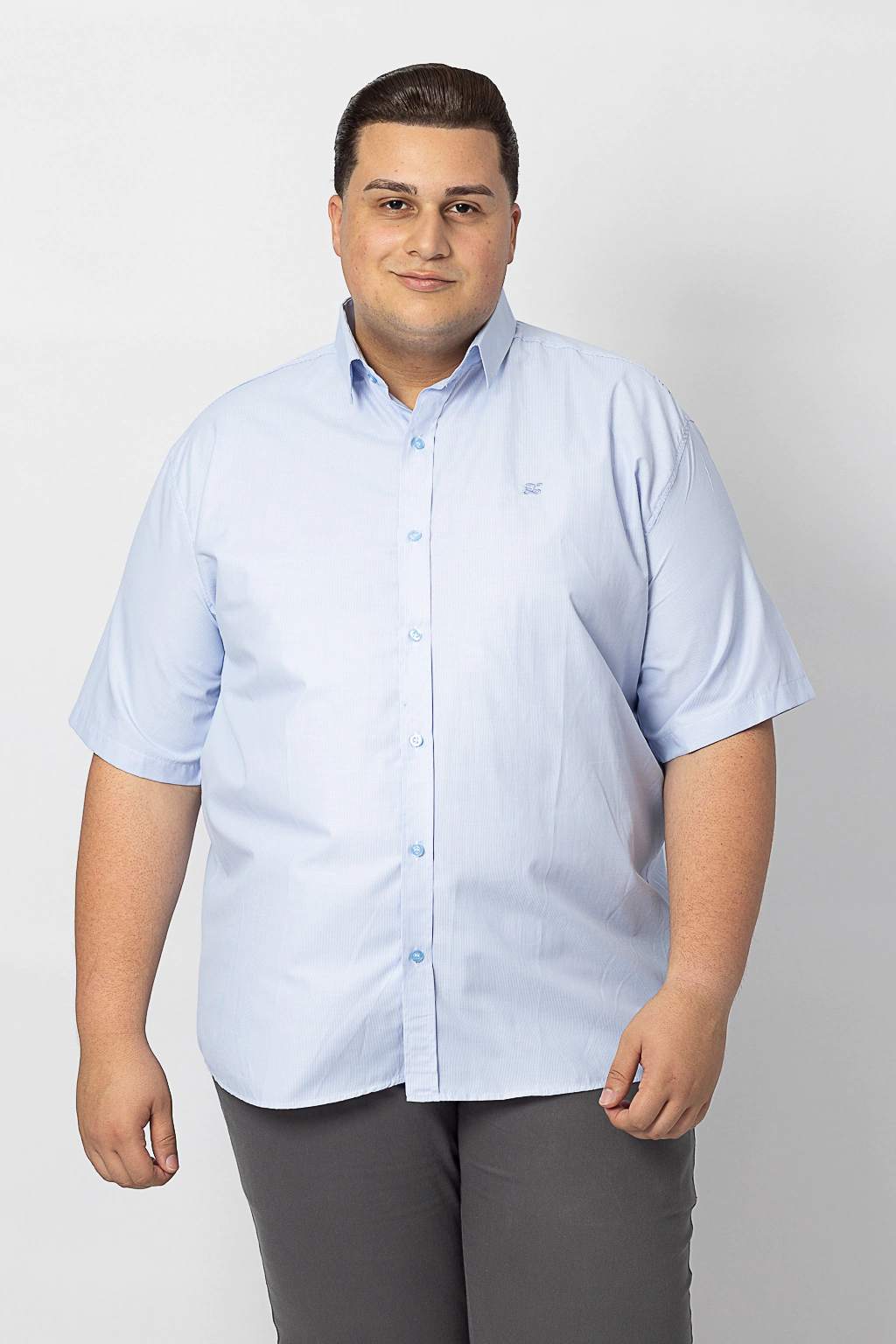 Descrição: Camisa Social Manga Curta Plus Size Mista Azul Clara Listrada