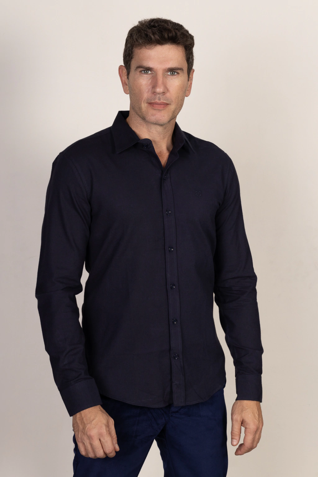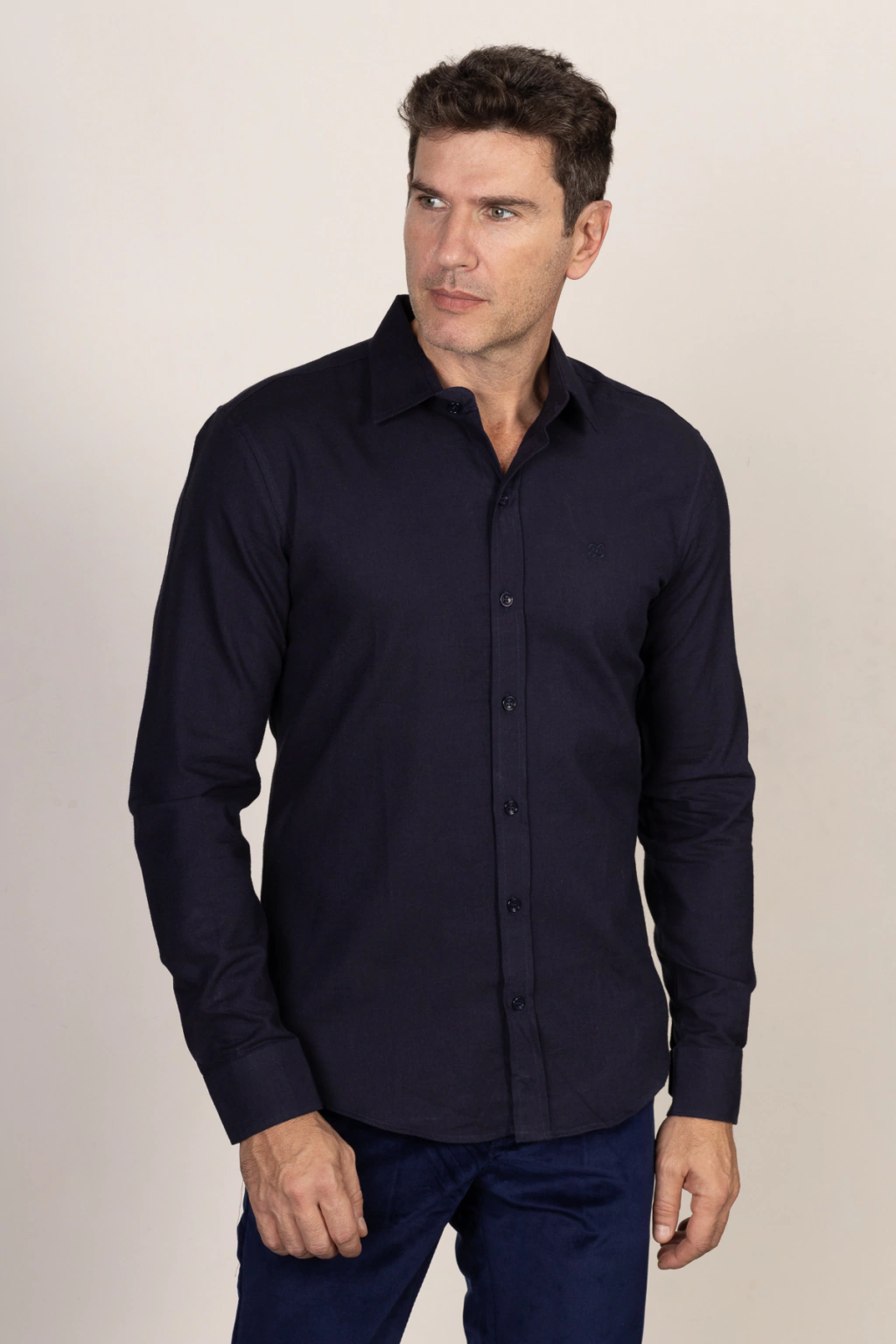 Descrição: Camisa Linho Tradicional Flanelada Azul Noite , confeccionada com algodão, colarinho francês