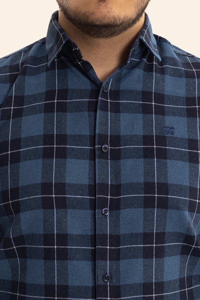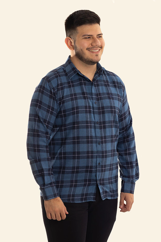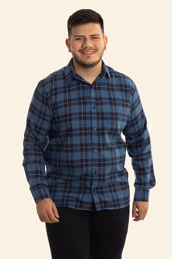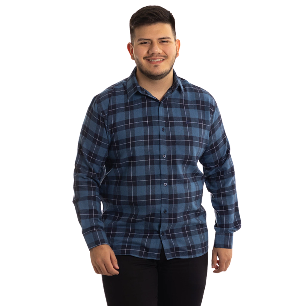Descrição: Camisa Flanelada Xadrez Tradicional Azul, confeccionada com algodão, colarinho francês
