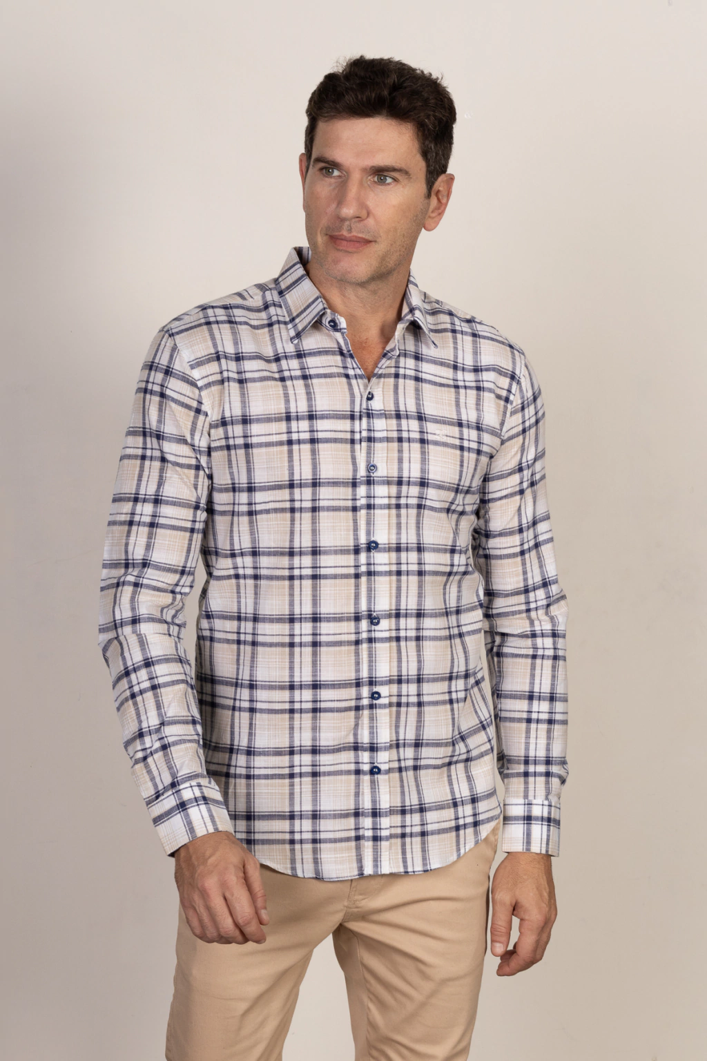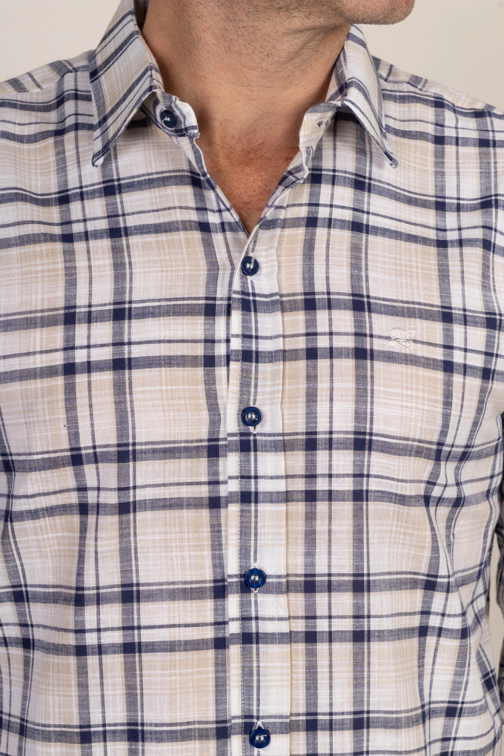 Descrição: Camisa Xadrez Slim fit Bege, confeccionada com algodão, colarinho francês