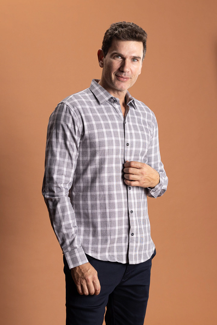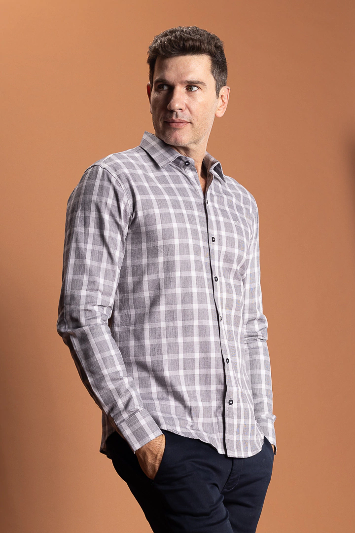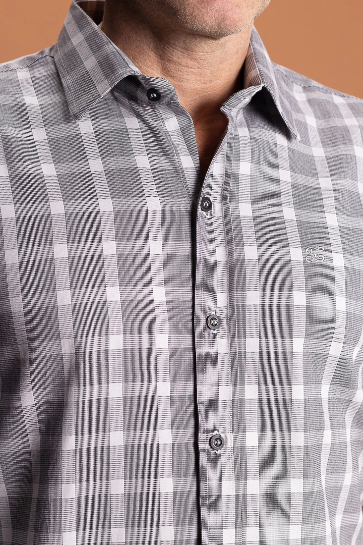 Descrição: Camisa Xadrez Slim fit Cinza, confeccionada com algodão, colarinho francês