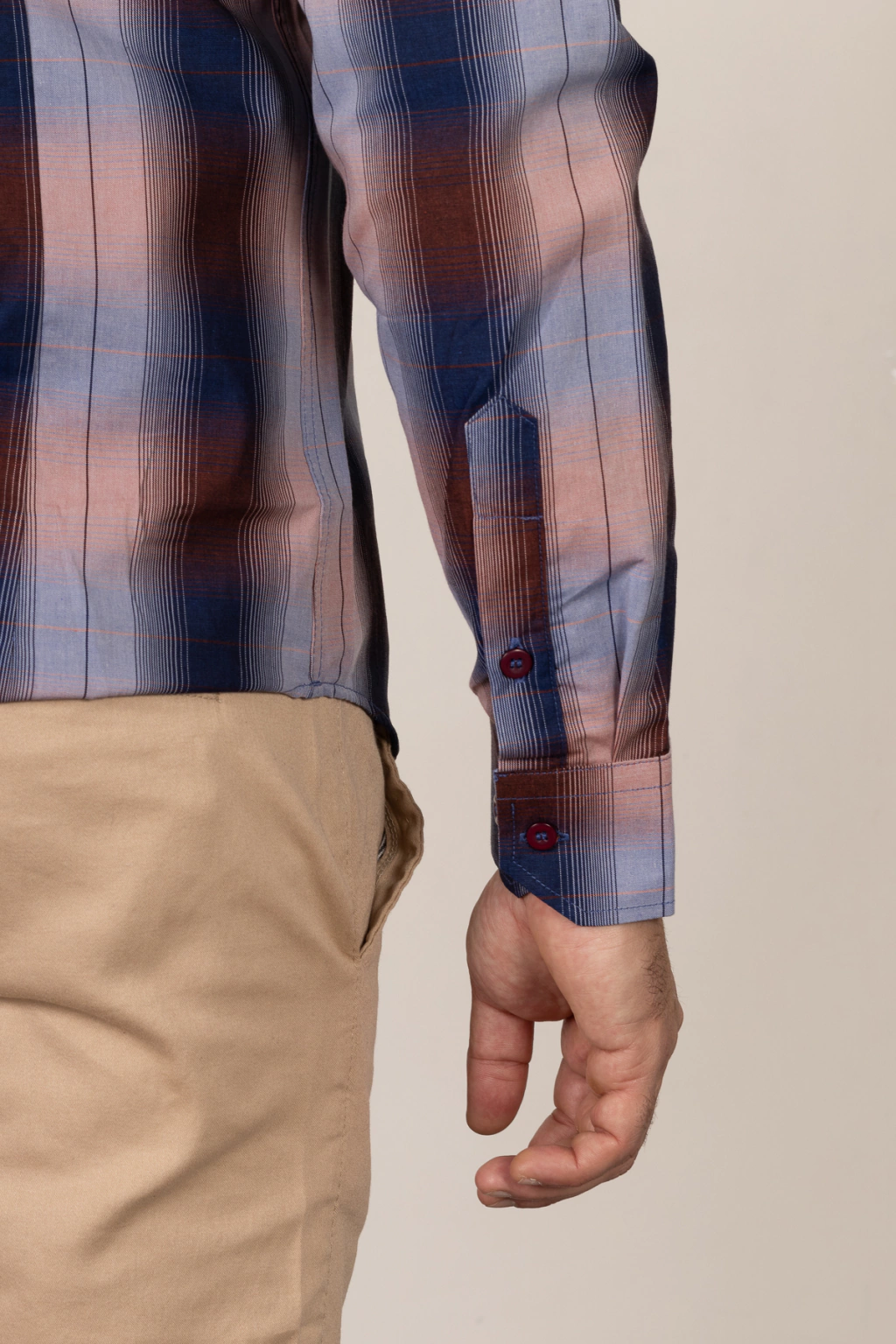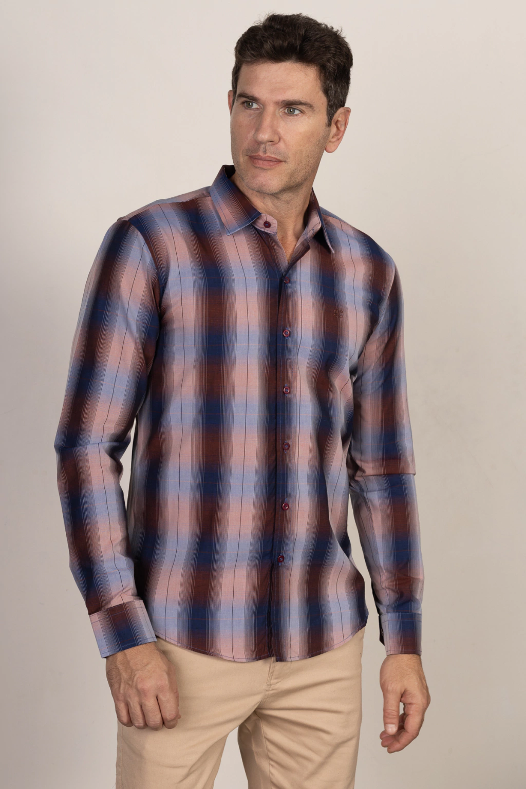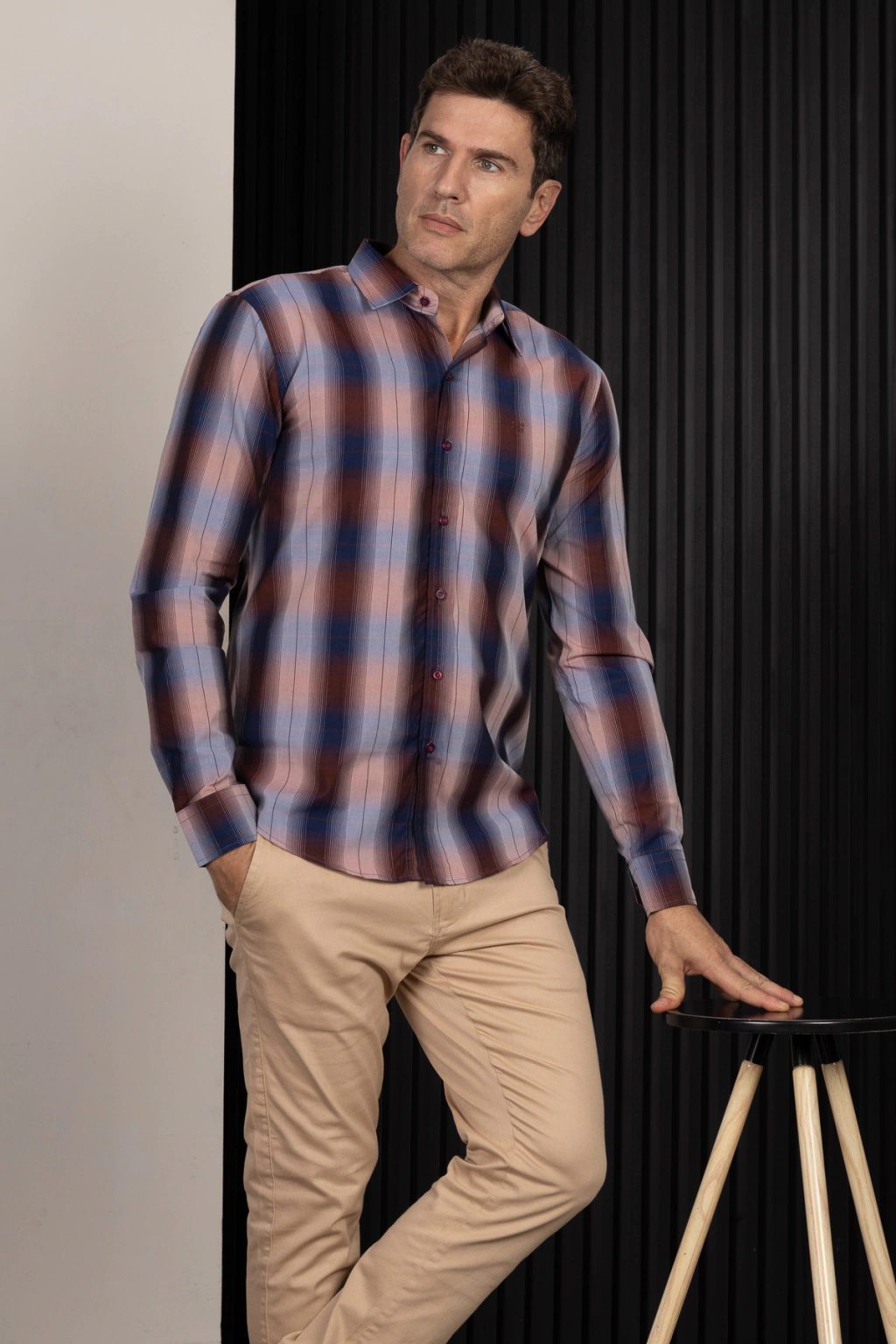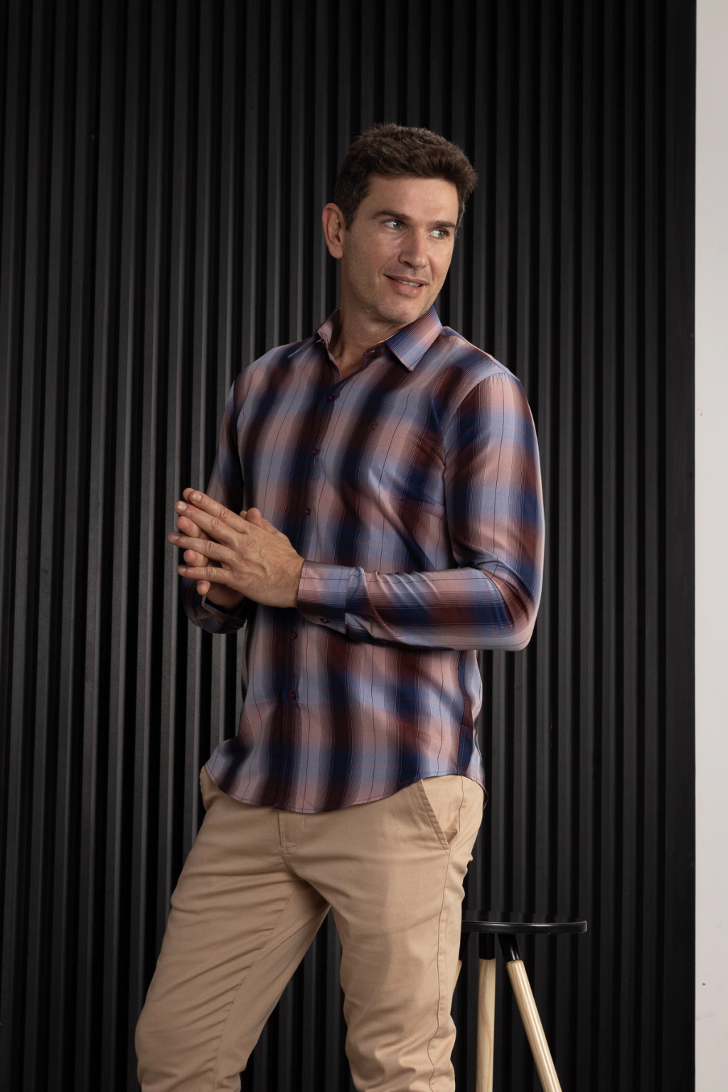 Descrição: Camisa Xadrez Slim fit Marsala, confeccionada com algodão, colarinho francês