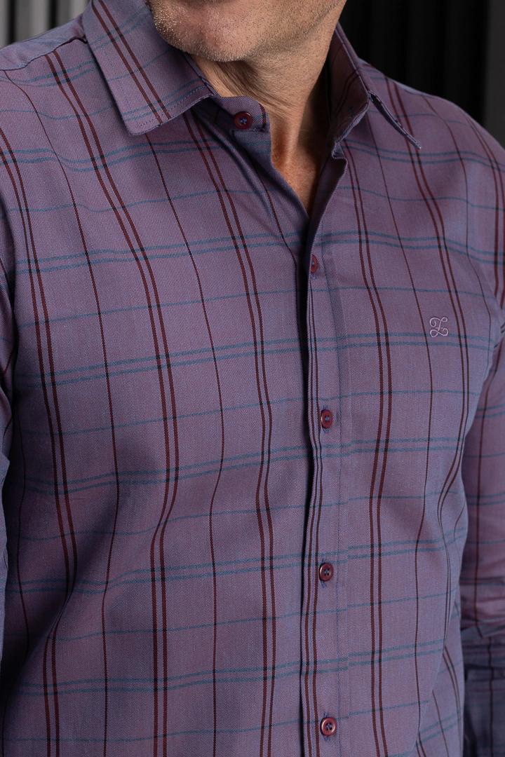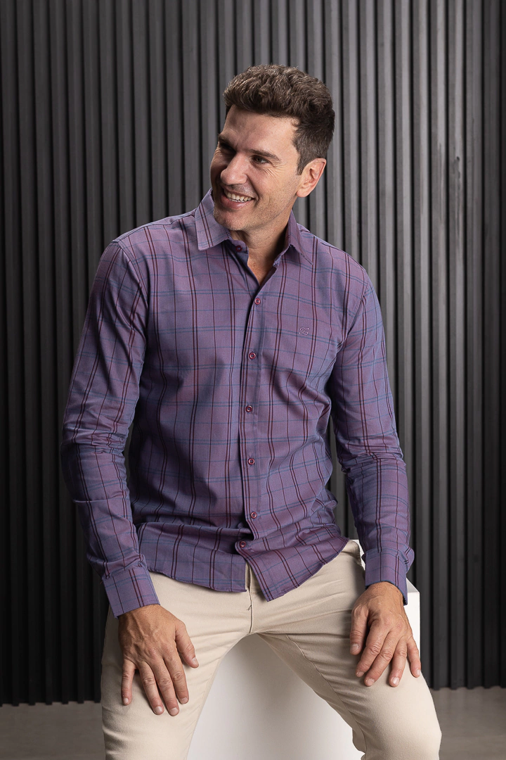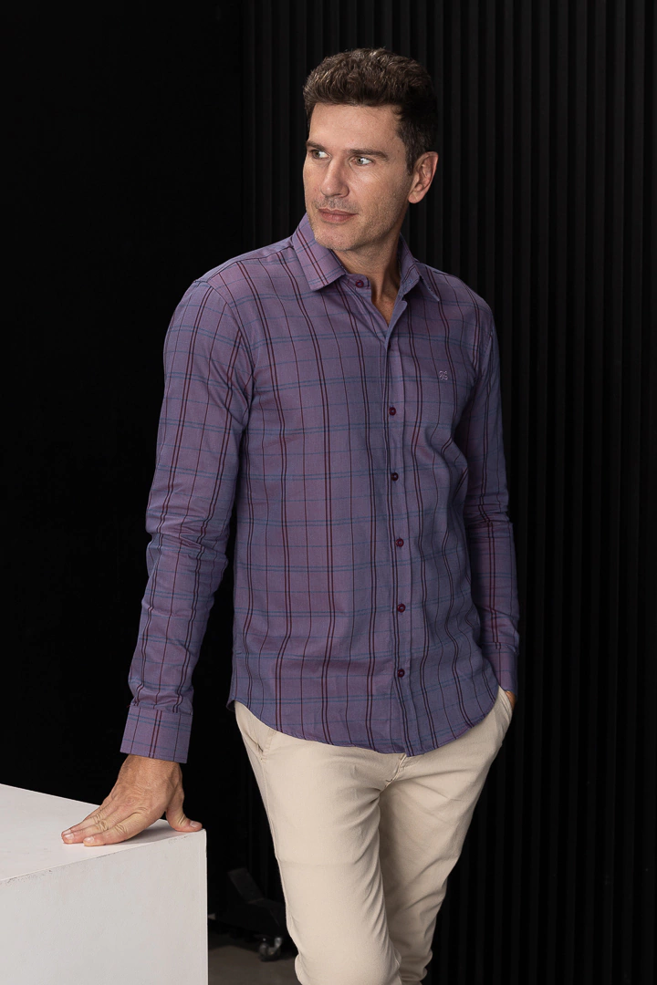 Descrição: Camisa Xadrez Slim fit Roxa, confeccionada com algodão, colarinho francês