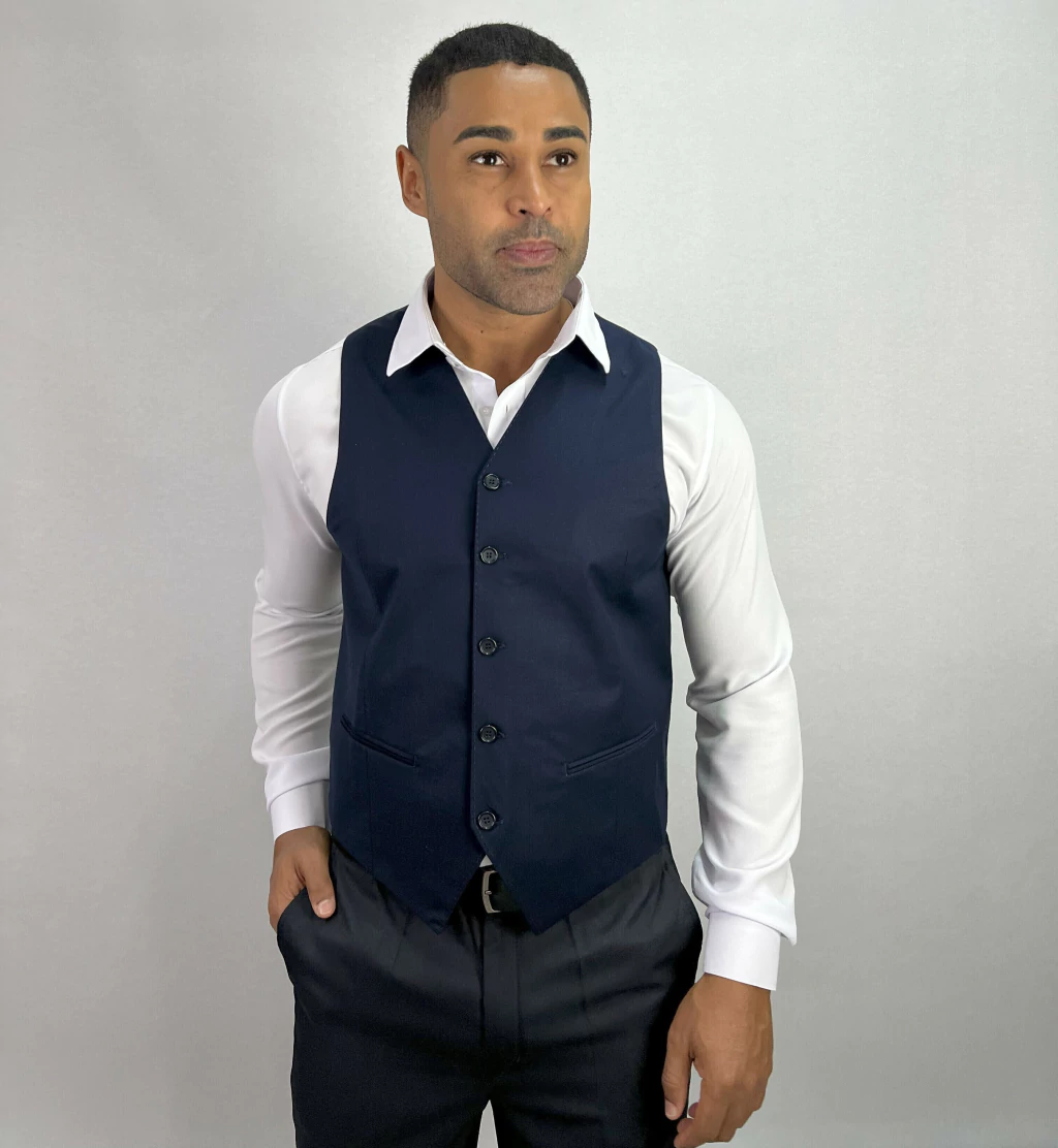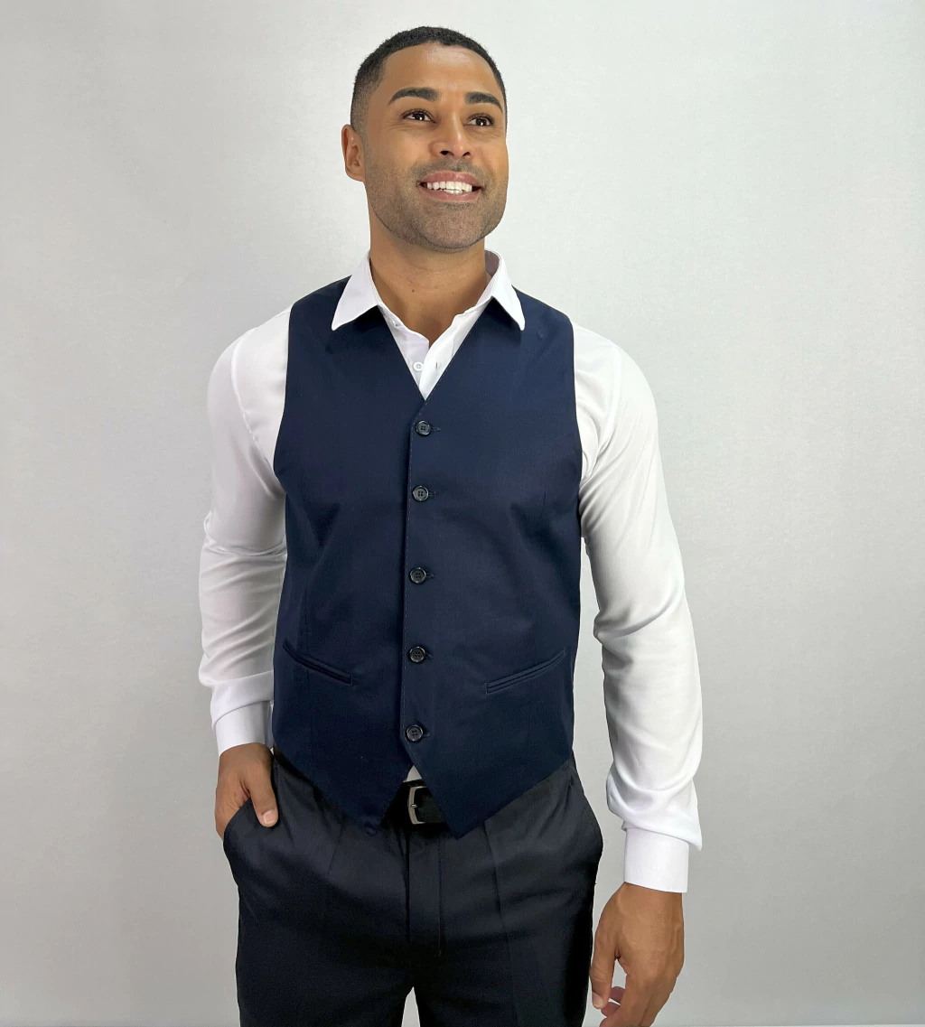 Descrição: Colete de poliviscose Azul Noite com ajuste de tamanho nas costas