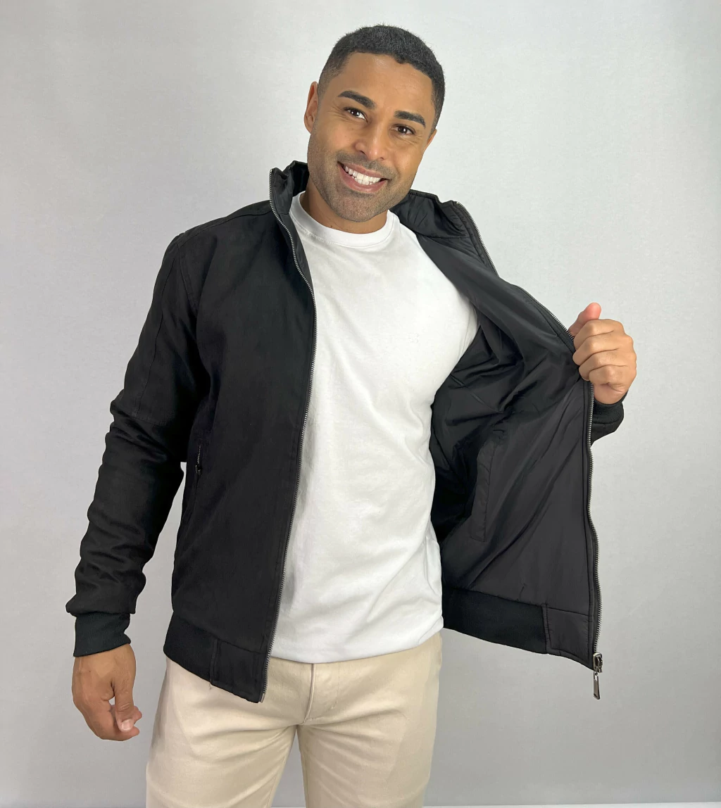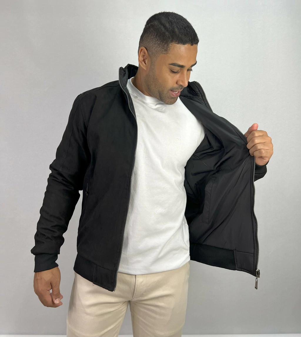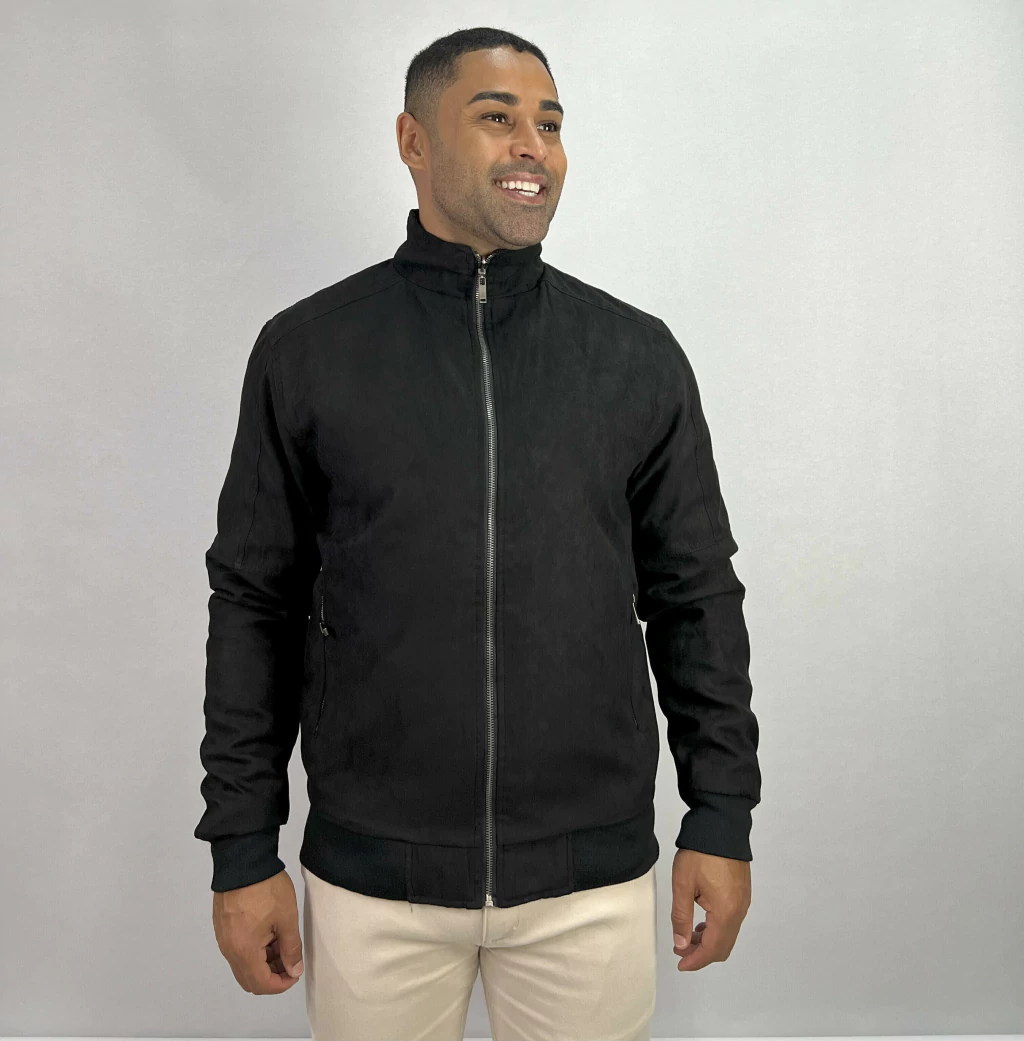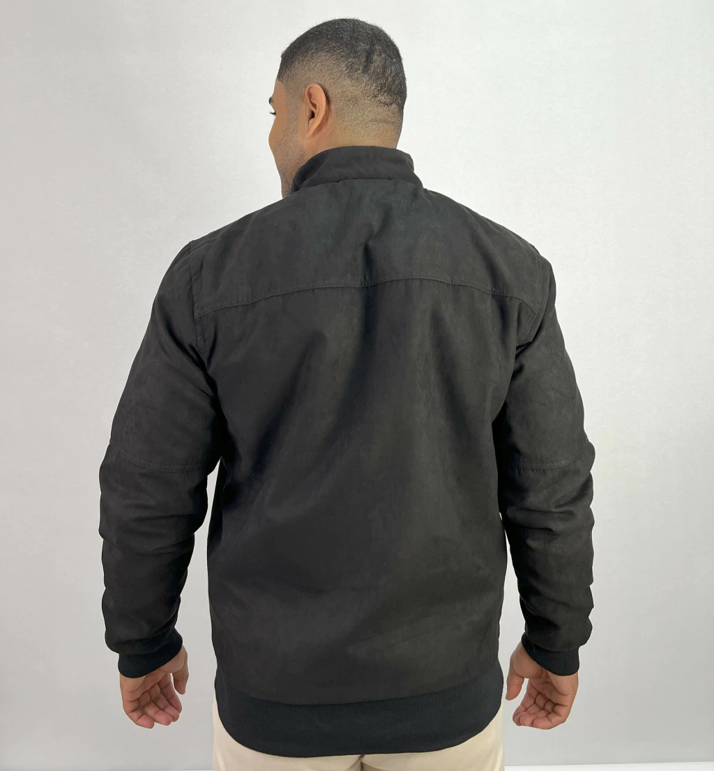 Descrição: Jaqueta de Camurça Dupla face Preta,duas maneiras de se utilizar, sem capuz, bolsos laterais com zíper