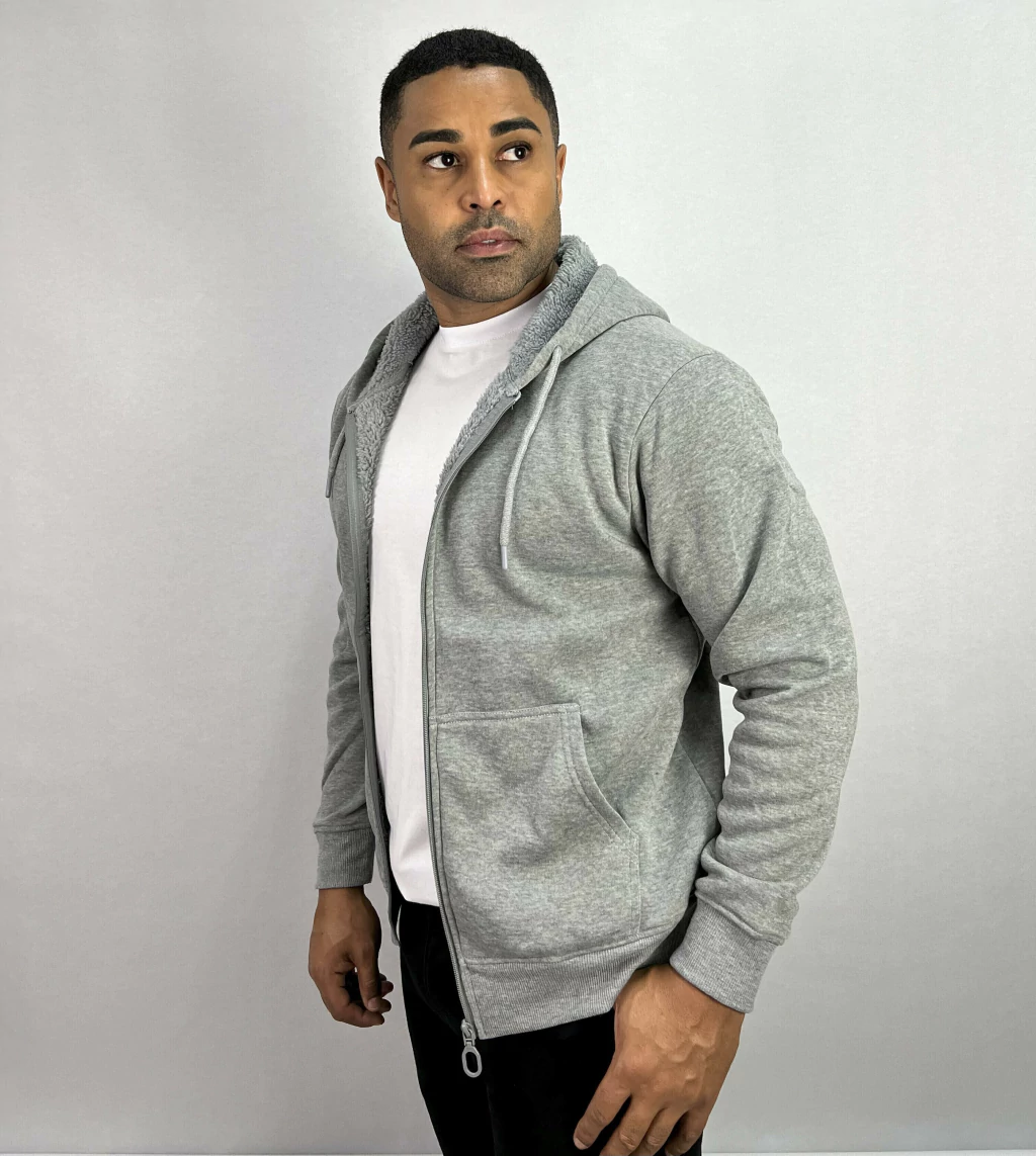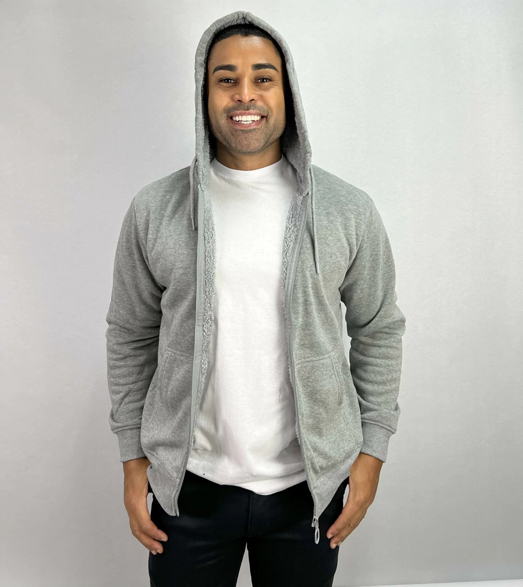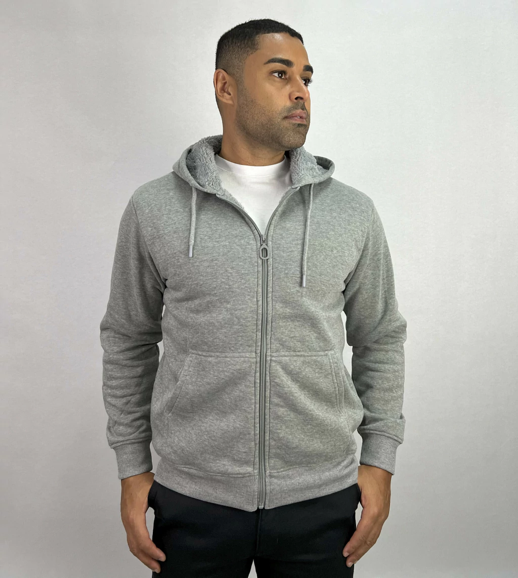 Descrição: Jaqueta de Moletom com Capuz Cinza,com 2 bolsos externos com zíper, zíper no fechamento da peça, forro com pelo.