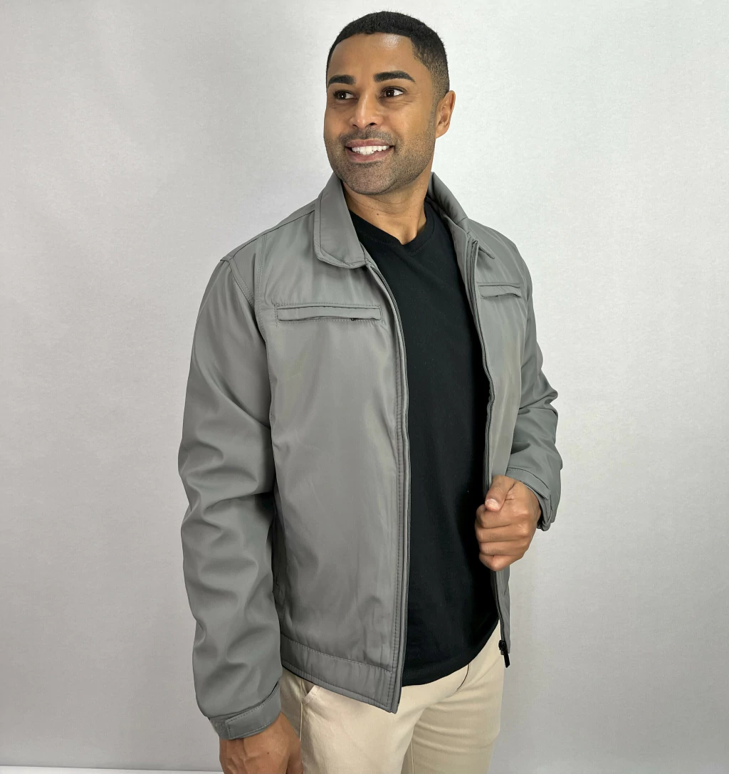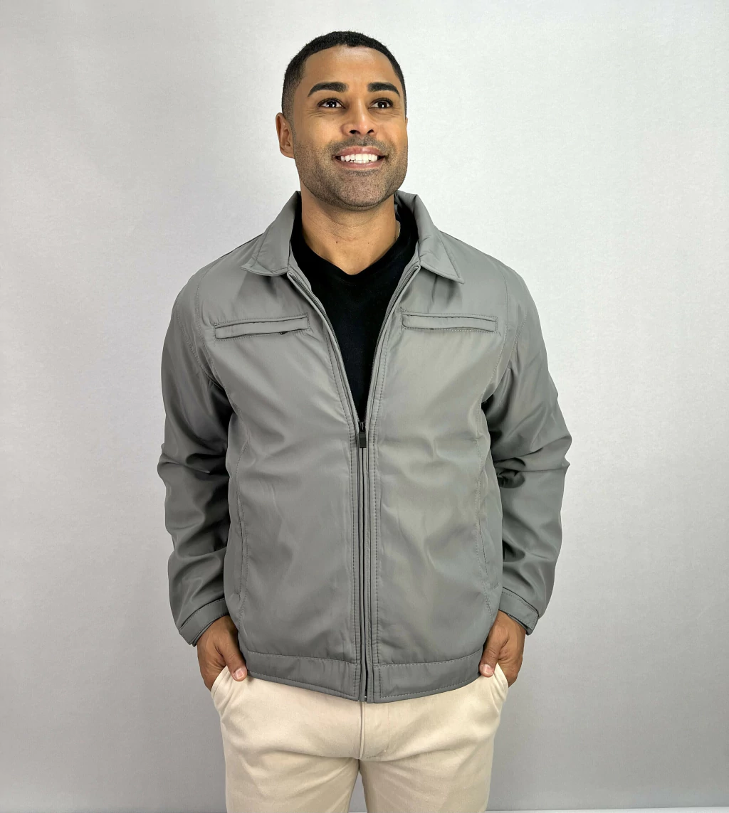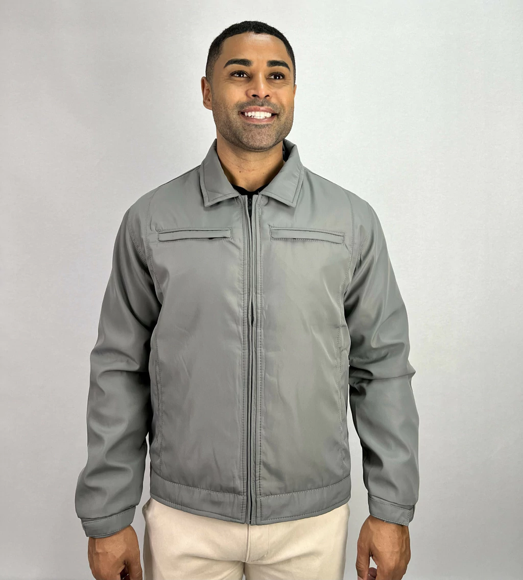 Descrição: Jaqueta Microfibra Confort Tradicional Cinza com 2 bolsos externos com zíper, detalhe de um bolso lateral frontal, botões e zíper no fechamento da peça.