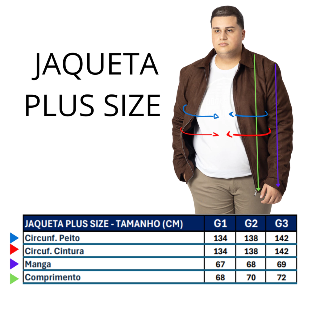 Descrição: Jaqueta Plus Size Camurça Confort Tradicional, com 2 bolsos externos com zíper, zíper no fechamento na peça