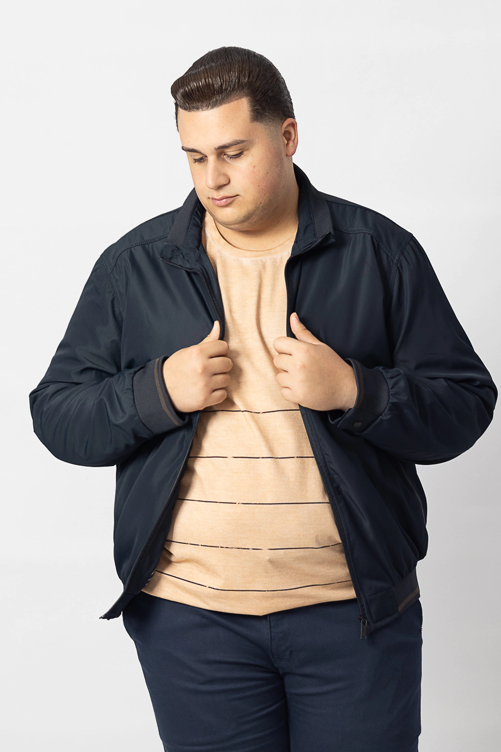 DESCRIÇÃO: Jaqueta Plus Size Microfibra Confort Tradicional Azul Noite, com 2 bolsos externos com zíper, zíper no fechamento da peça.