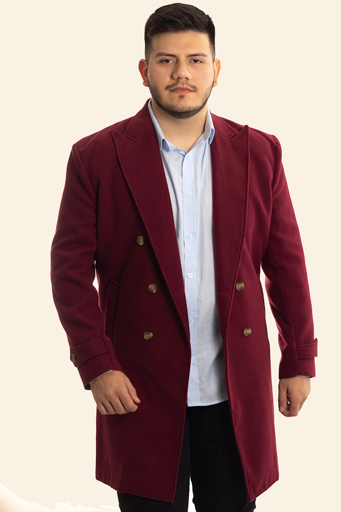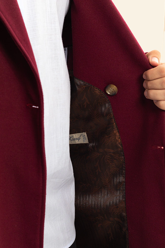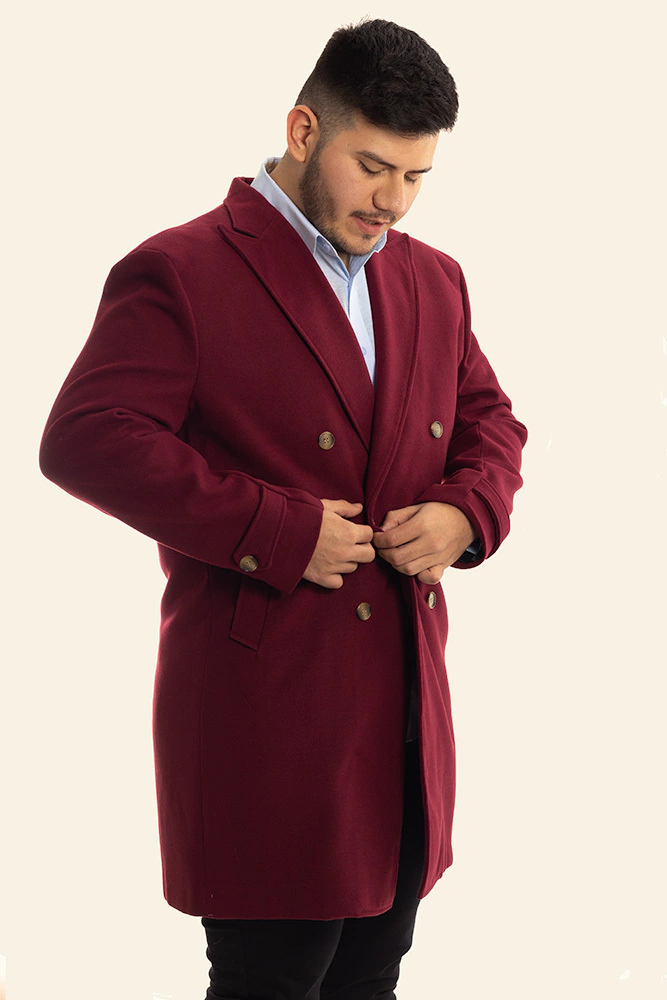 Descrição: Sobretudo Clássico Confort Lã prensada vinho, com botões extenos, com fendas laterais