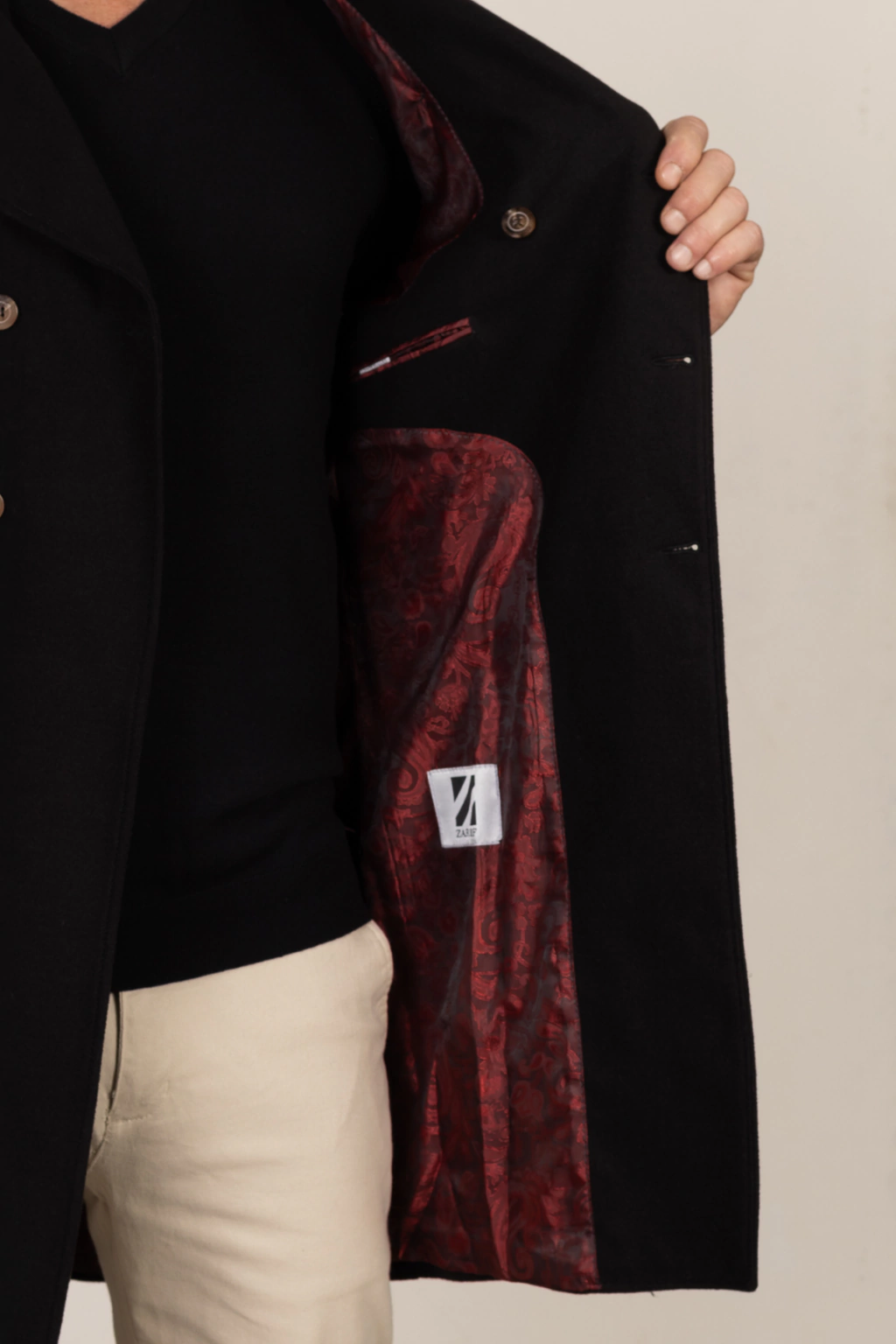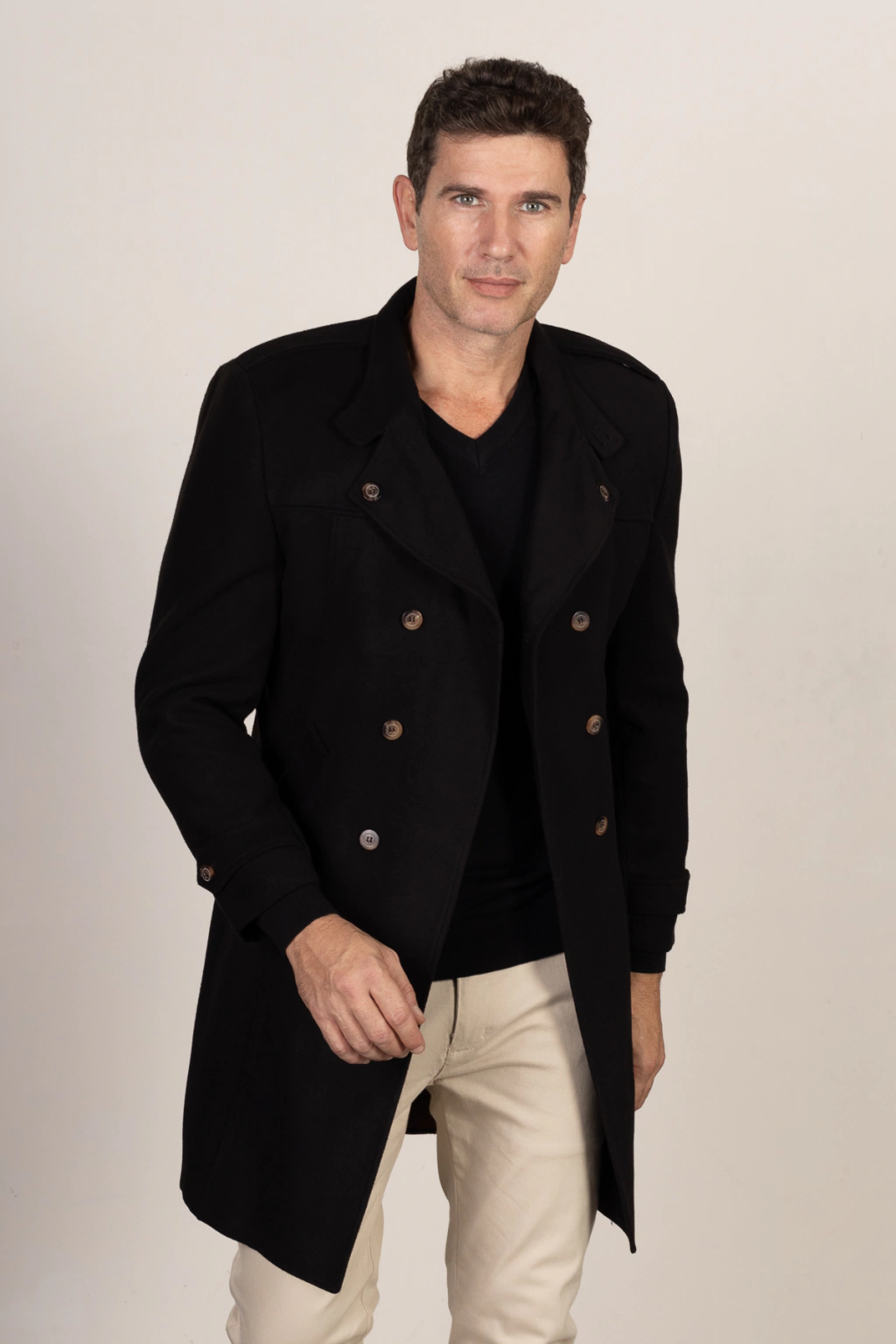 Descrição: Sobretudo Slim Fit Lã prensada preto, com botões extenos e internos, com fendas laterais