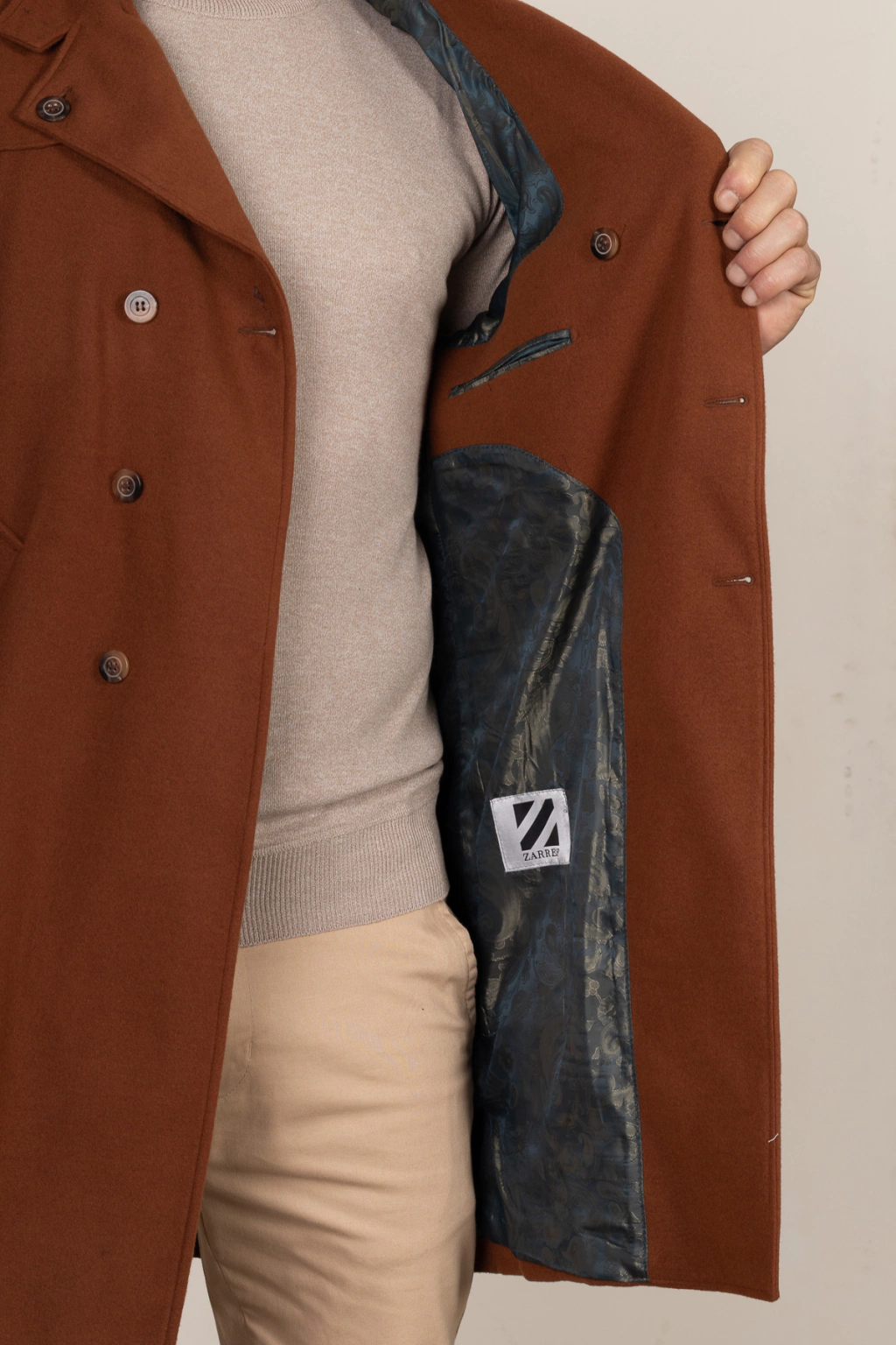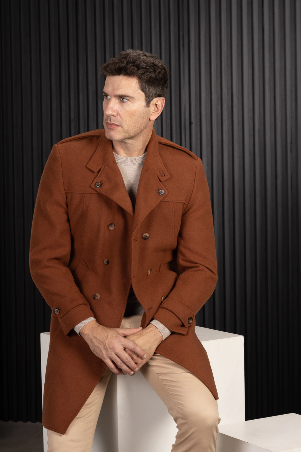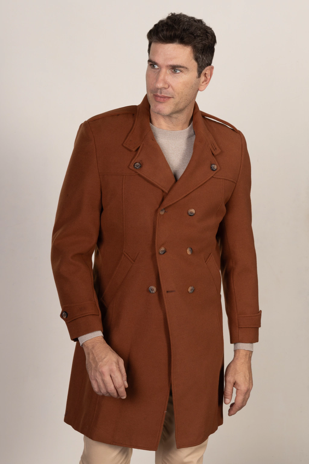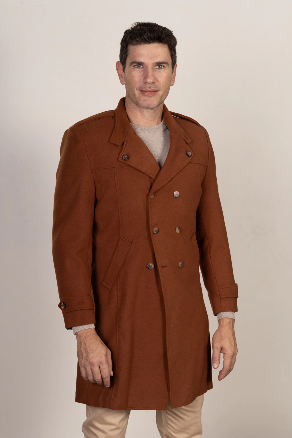 Descrição: Sobretudo Slim Fit Lã prensada terra cota, com botões extenos e internos, com fendas laterais