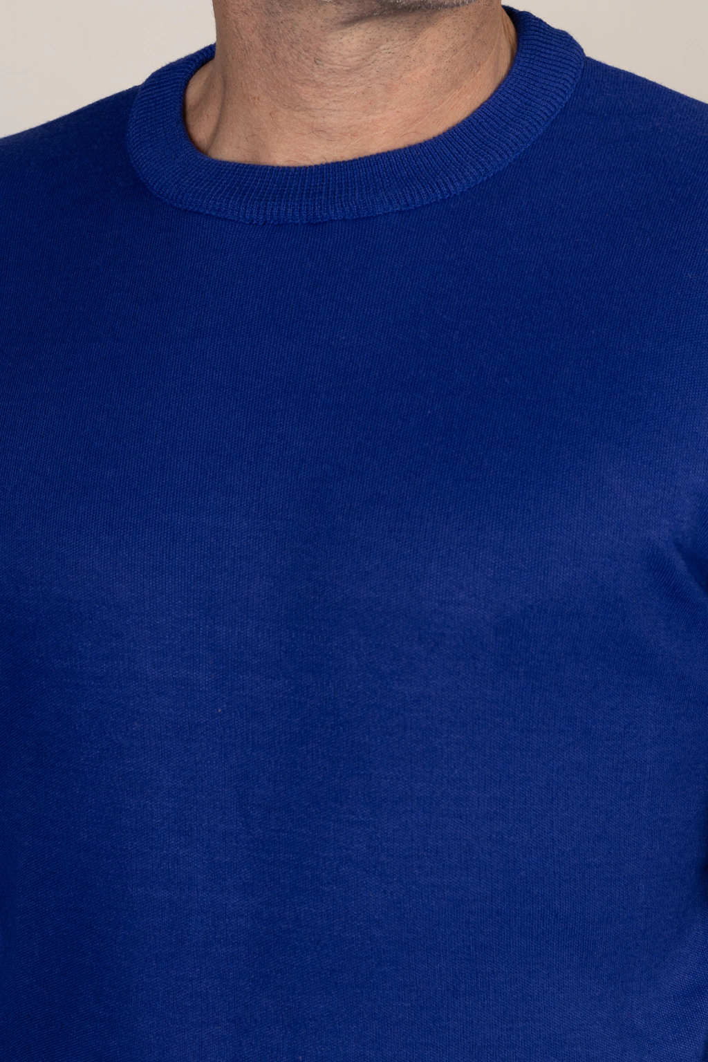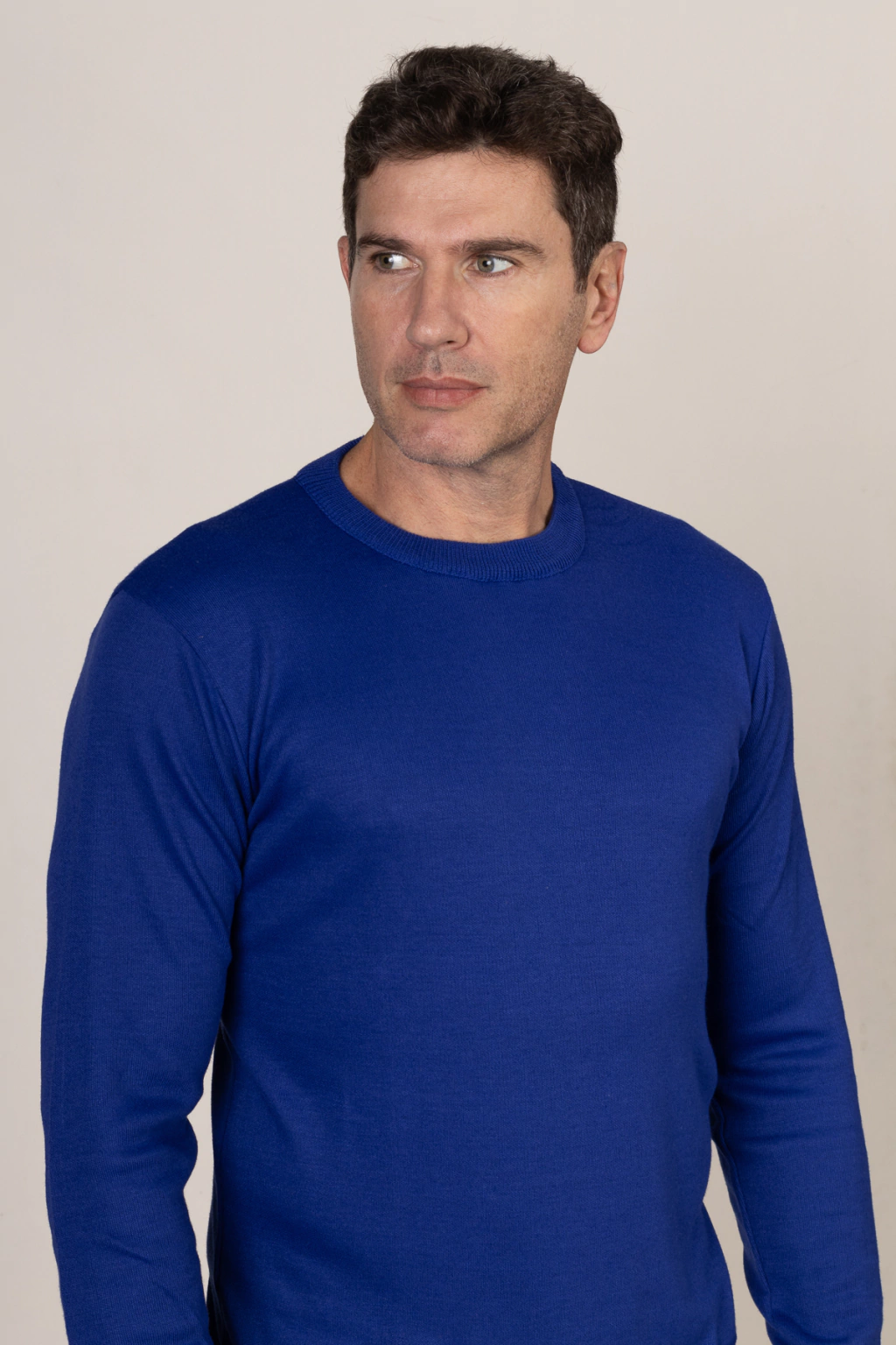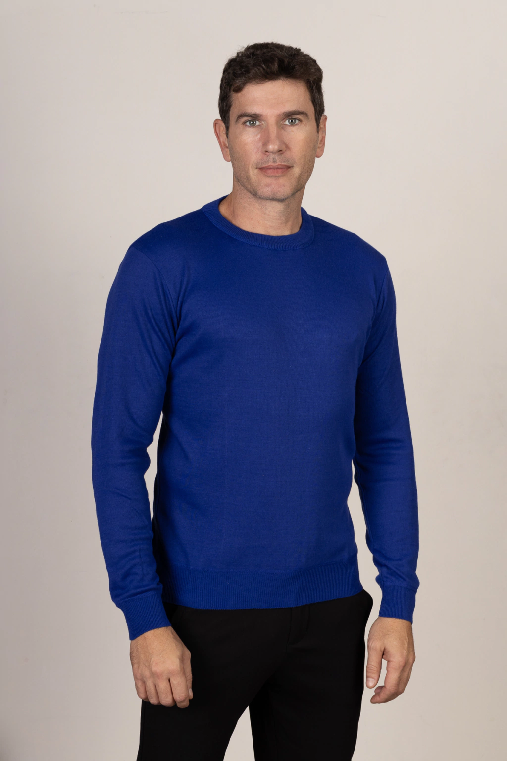 Descrição: Suéter de Lã Confort Azul bic, gola redonda e punhos