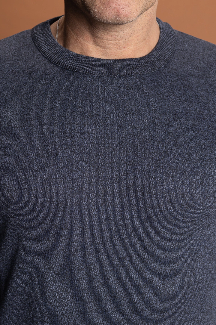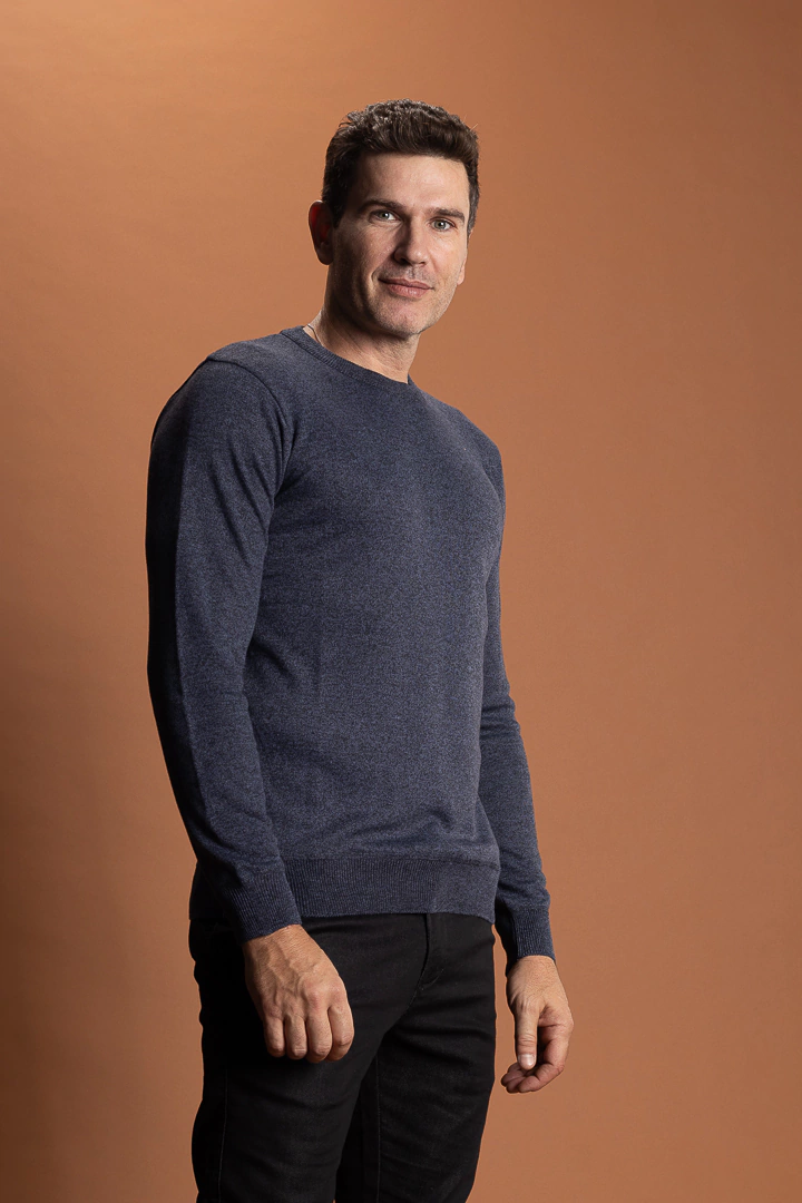 Descrição: Suéter de Lã Liso Azul Magnetado, gola redonda e punhos