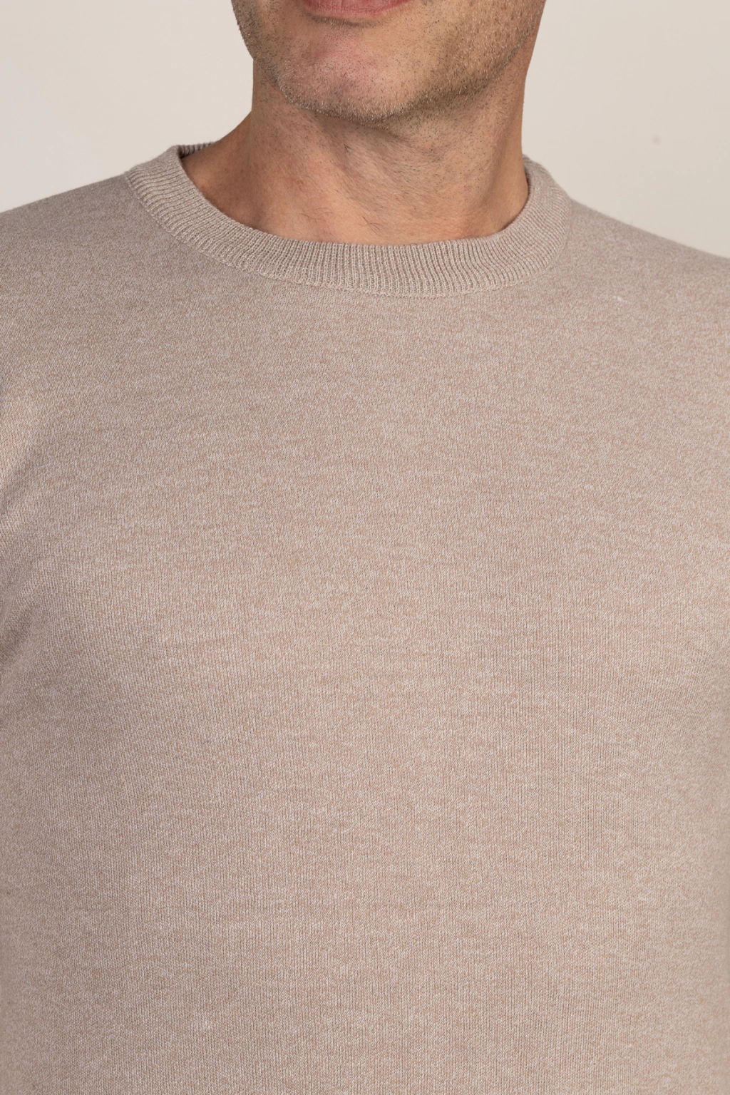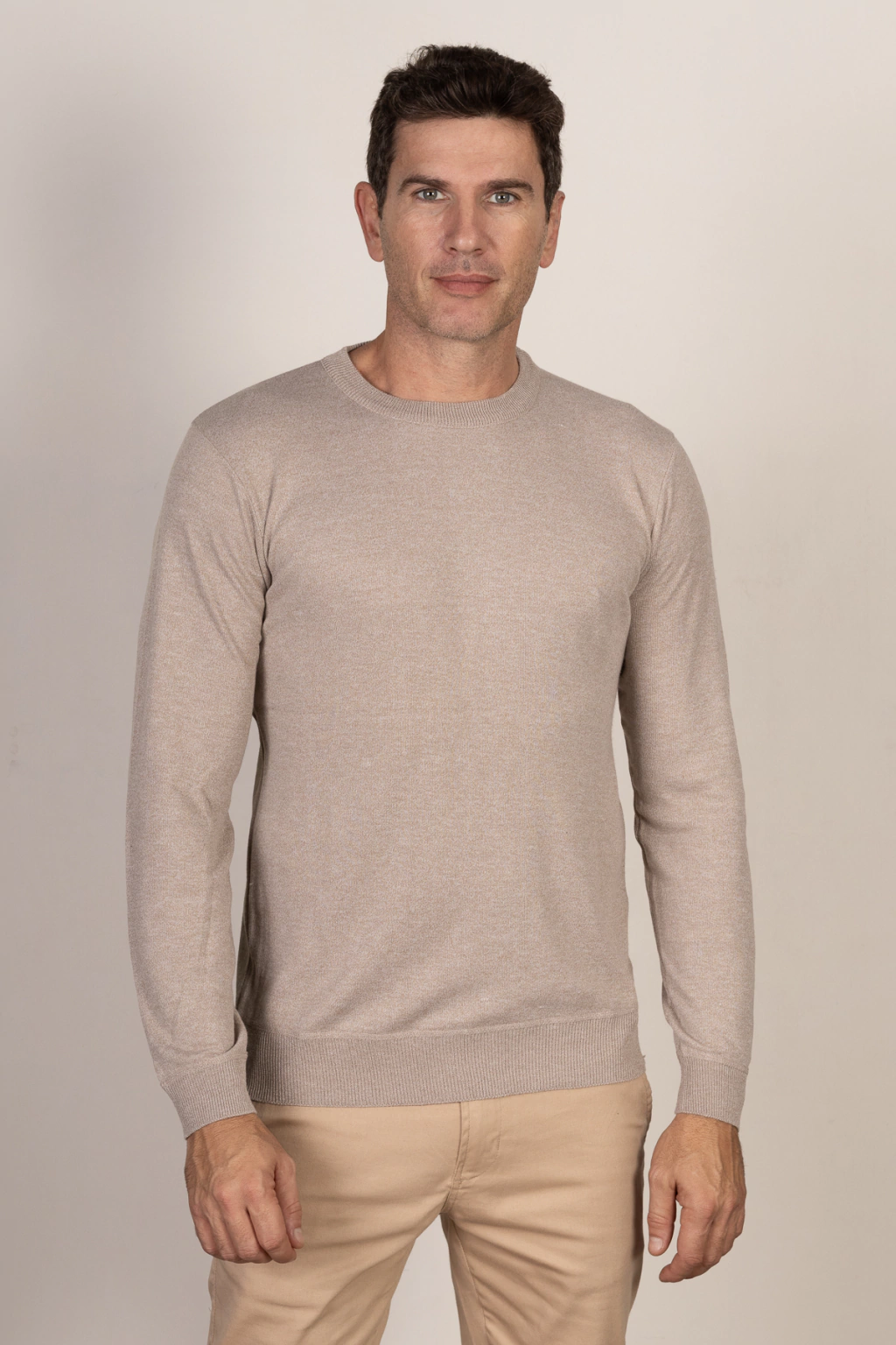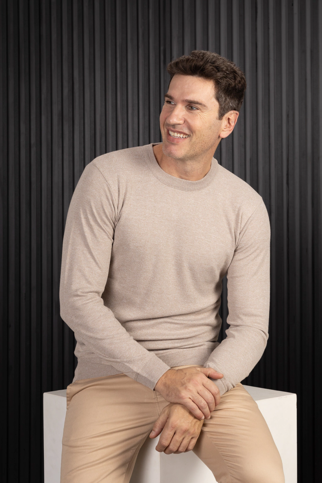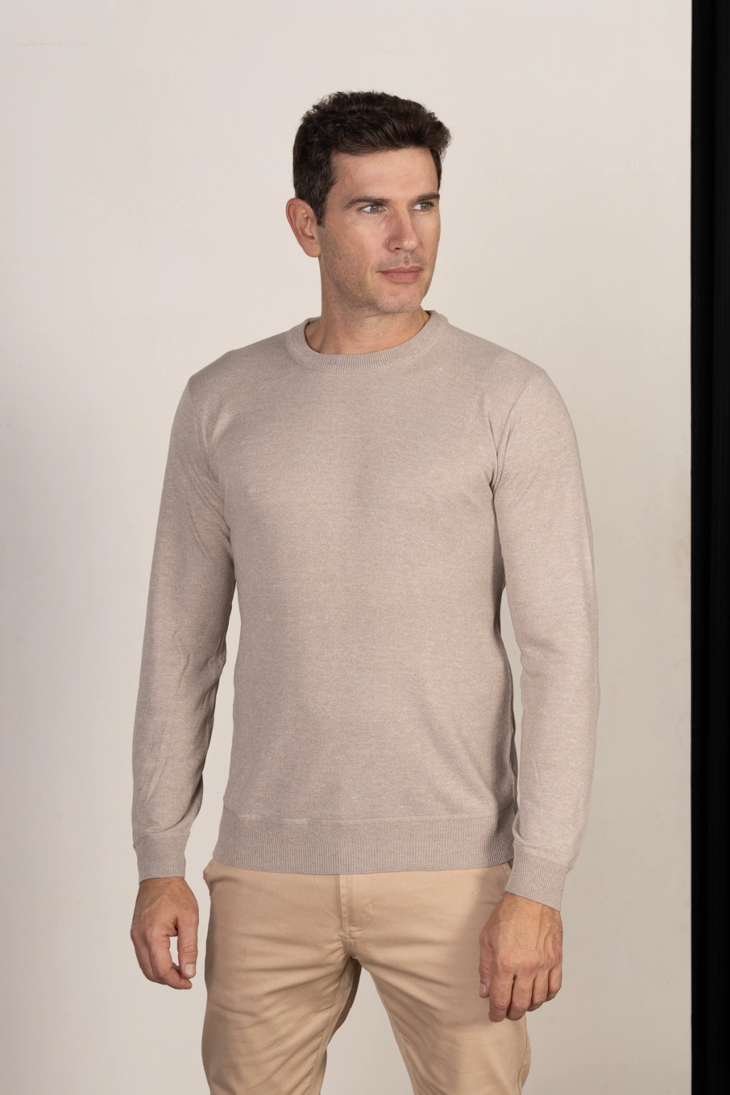 Descrição: Suéter de Lã Confort Bege, gola redonda e punhos