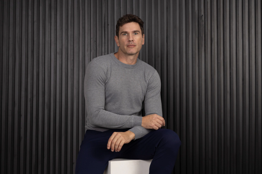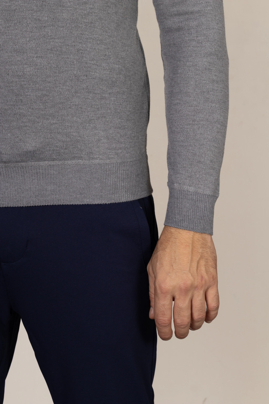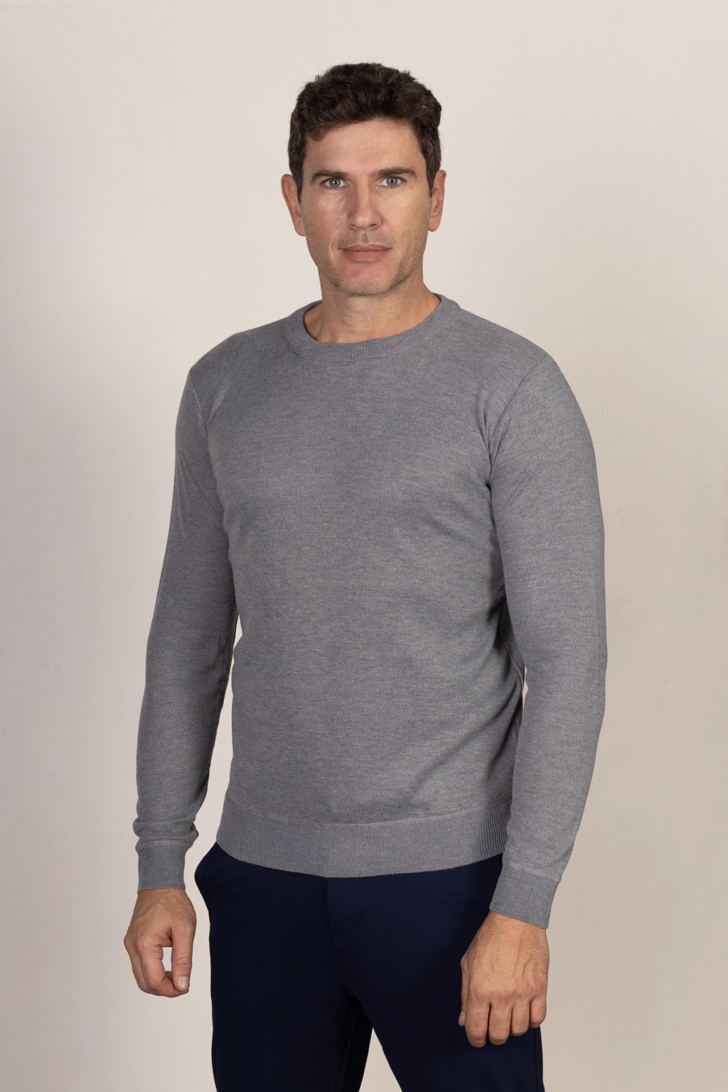 Descrição: Suéter de Lã Confort cinza, gola redonda e punhos
