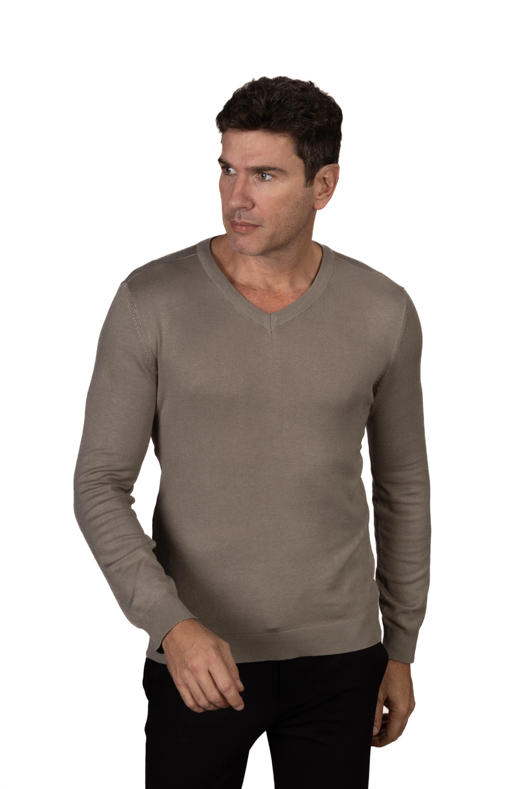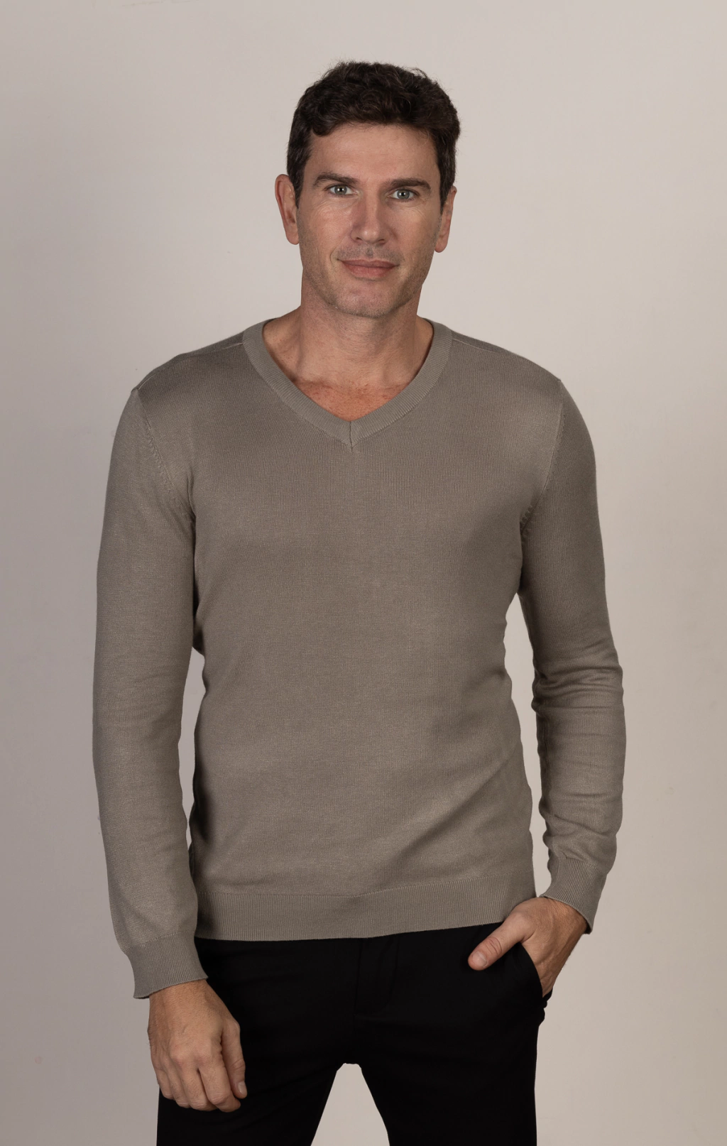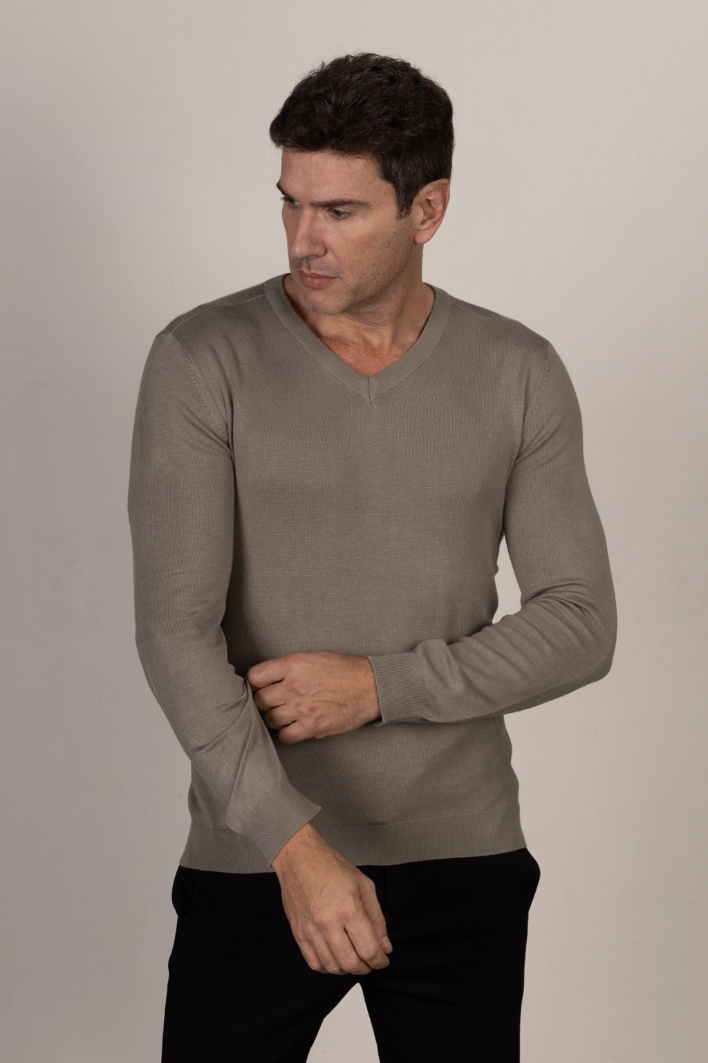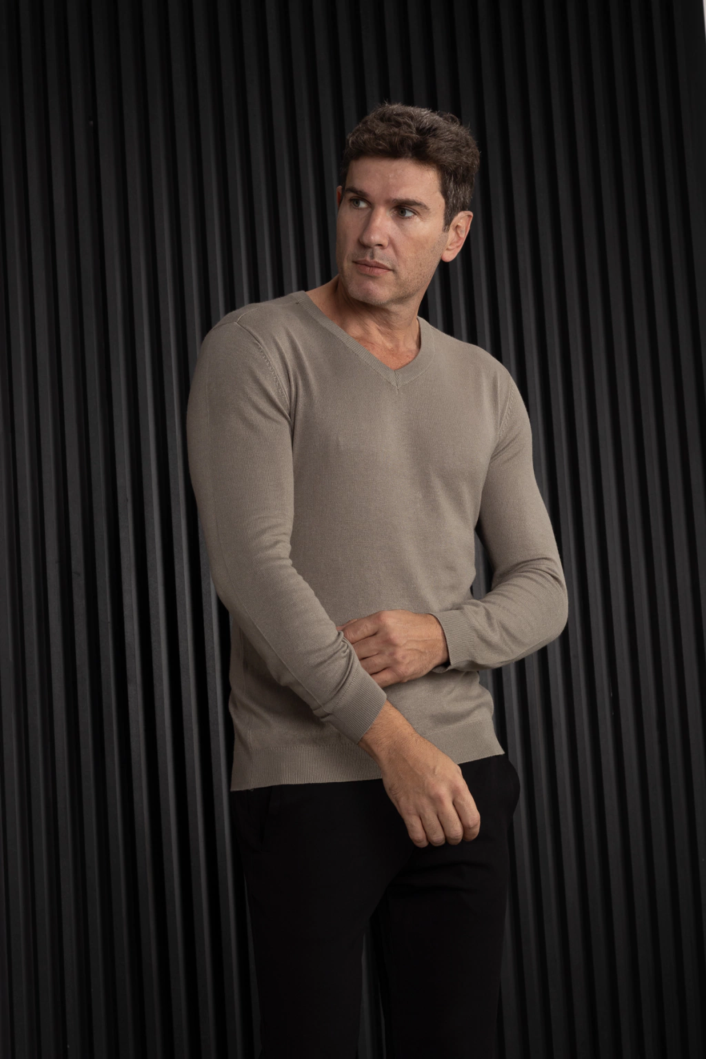 Descrição: Suéter de Lã Slim Fit bege , gola V e punhos