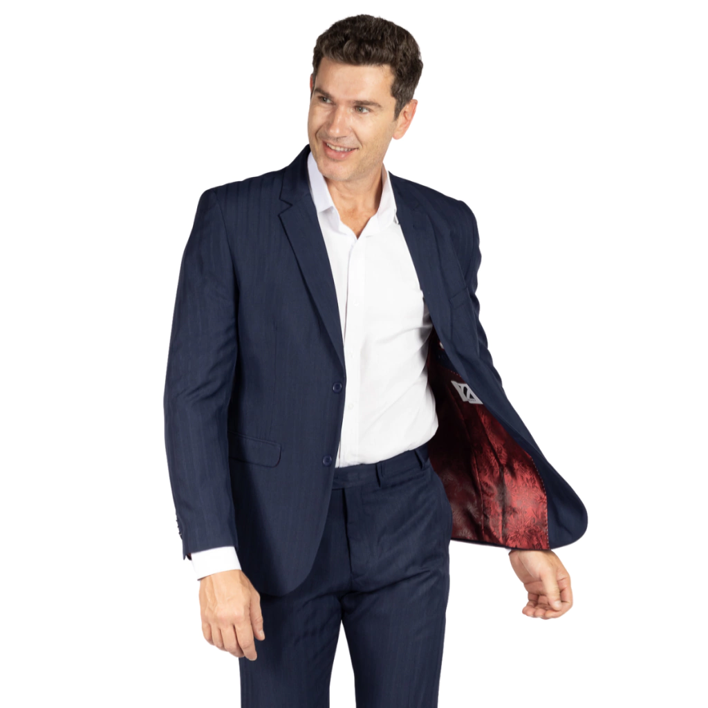 Descrição: Terno Azul Marinho com modelagem tradicional confort microfibra , conta com duas fendas laterais, duas fendas traseiras, calça sem barra e pregas, sem colete.