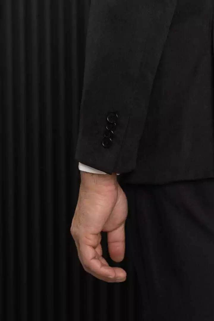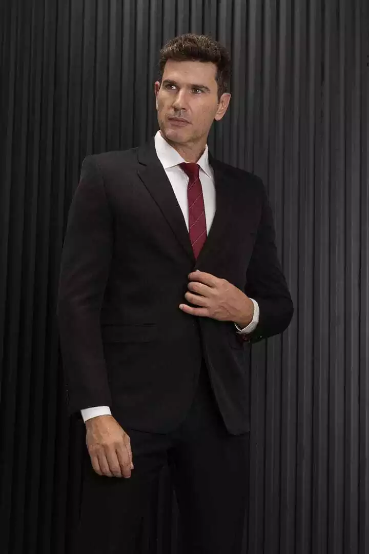 Descrição: Terno preto com modelagem tradicional confort microfibra , conta com duas fendas laterais, duas fendas traseiras, calça sem barra e pregas, sem colete.