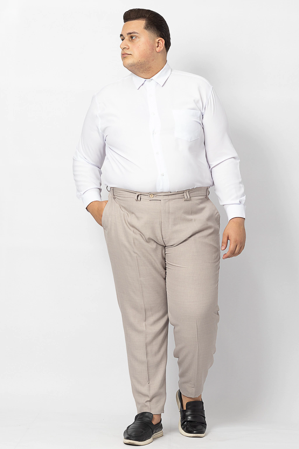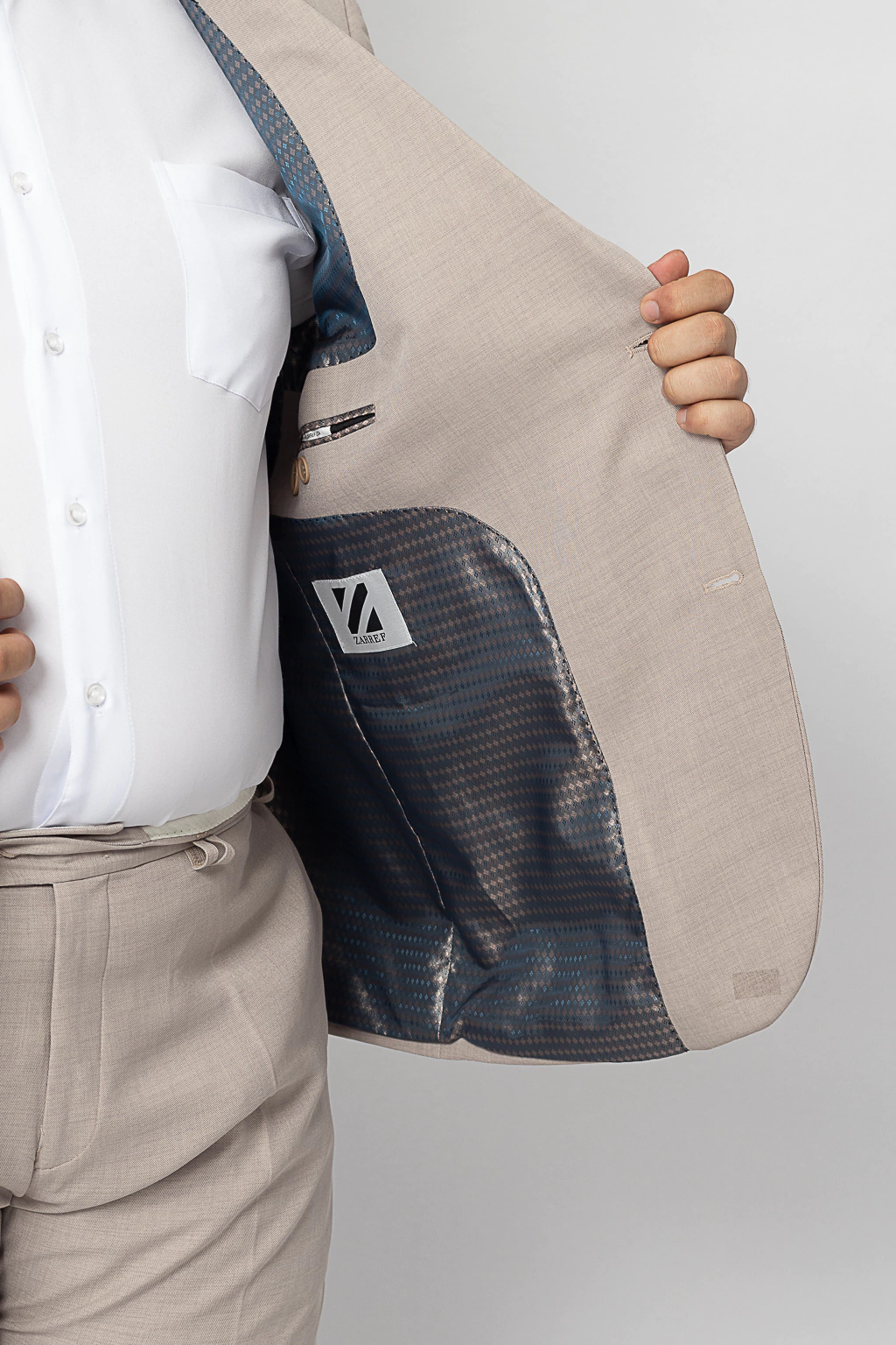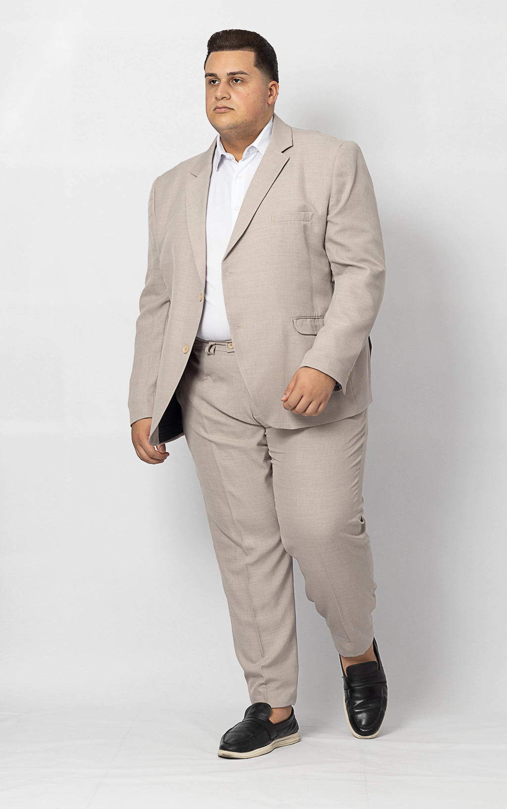Descrição: Terno Microfibra Plus Size Bege com modelagem tradicional confort, conta com duas fendas laterais, duas fendas traseiras, calça sem barra e pregas e dois bolsos internos, sem colete.