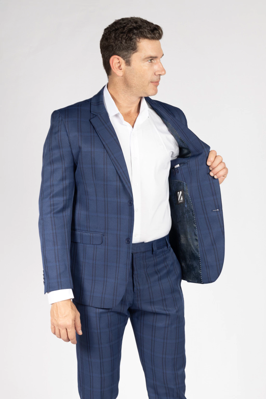 Um terno xadrez Príncipe de Gales semi slim Azul Bic é uma peça elegante e atemporal. O padrão Príncipe de Gales é um clássico, caracterizado por grandes quadrados formados por linhas finas que criam um efeito de sobreposição, adicionando profundidade ao tecido. A cor bege é versátil e sofisticada, adequada para diversas ocasiões.